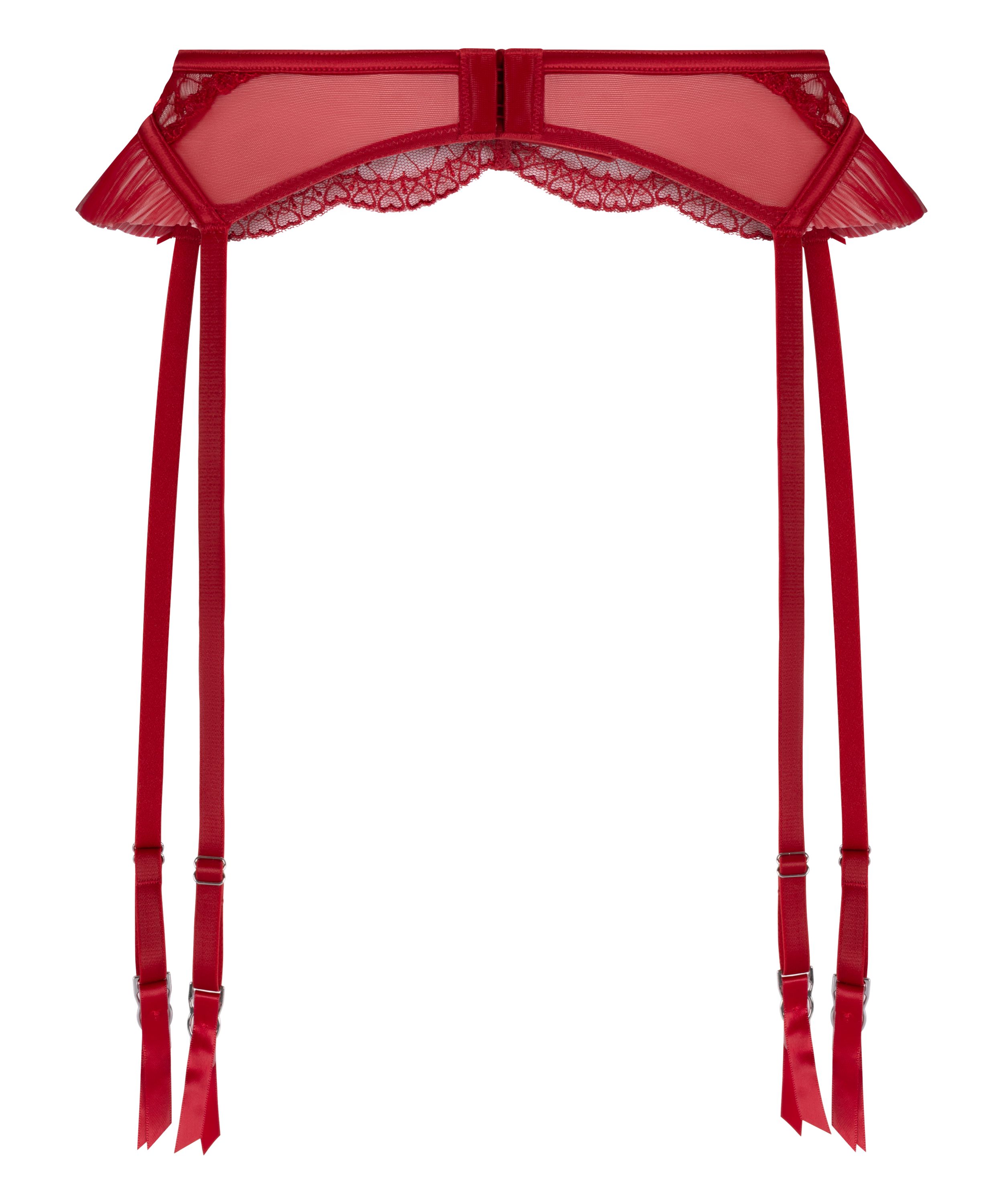 Añade un toque romántico a tu look de lencería con este elegante liguero, confeccionado en delicado encaje con una brillante joya en forma de corazón que le da un toque muy femenino. Las tiras regulables aseguran un ajuste perfecto, mientras que los elegantes lazos completan el diseño, digno de una princesa. Ideal para combinar con el sujetador y la brasileña a juego y lograr un look coordinado.