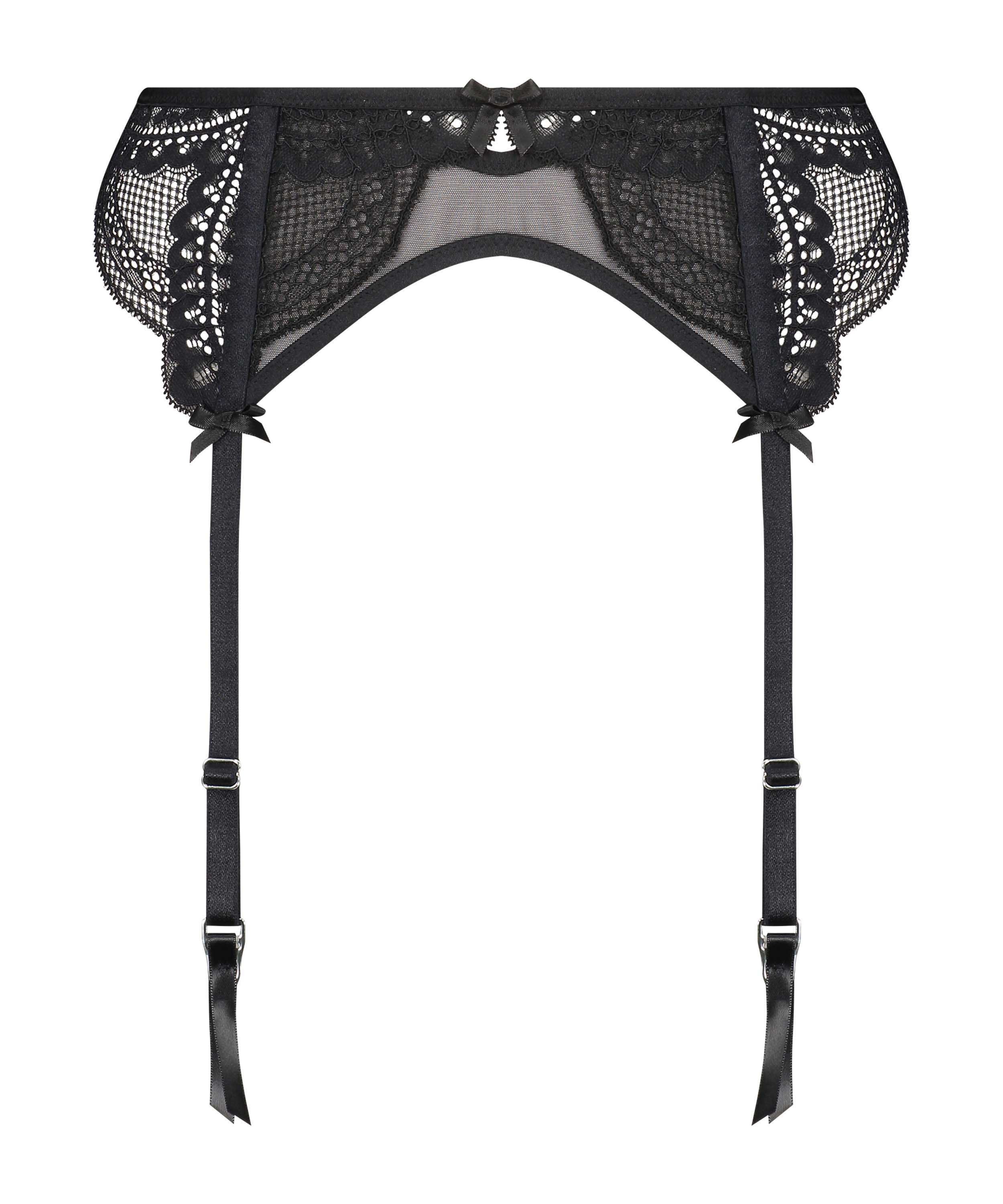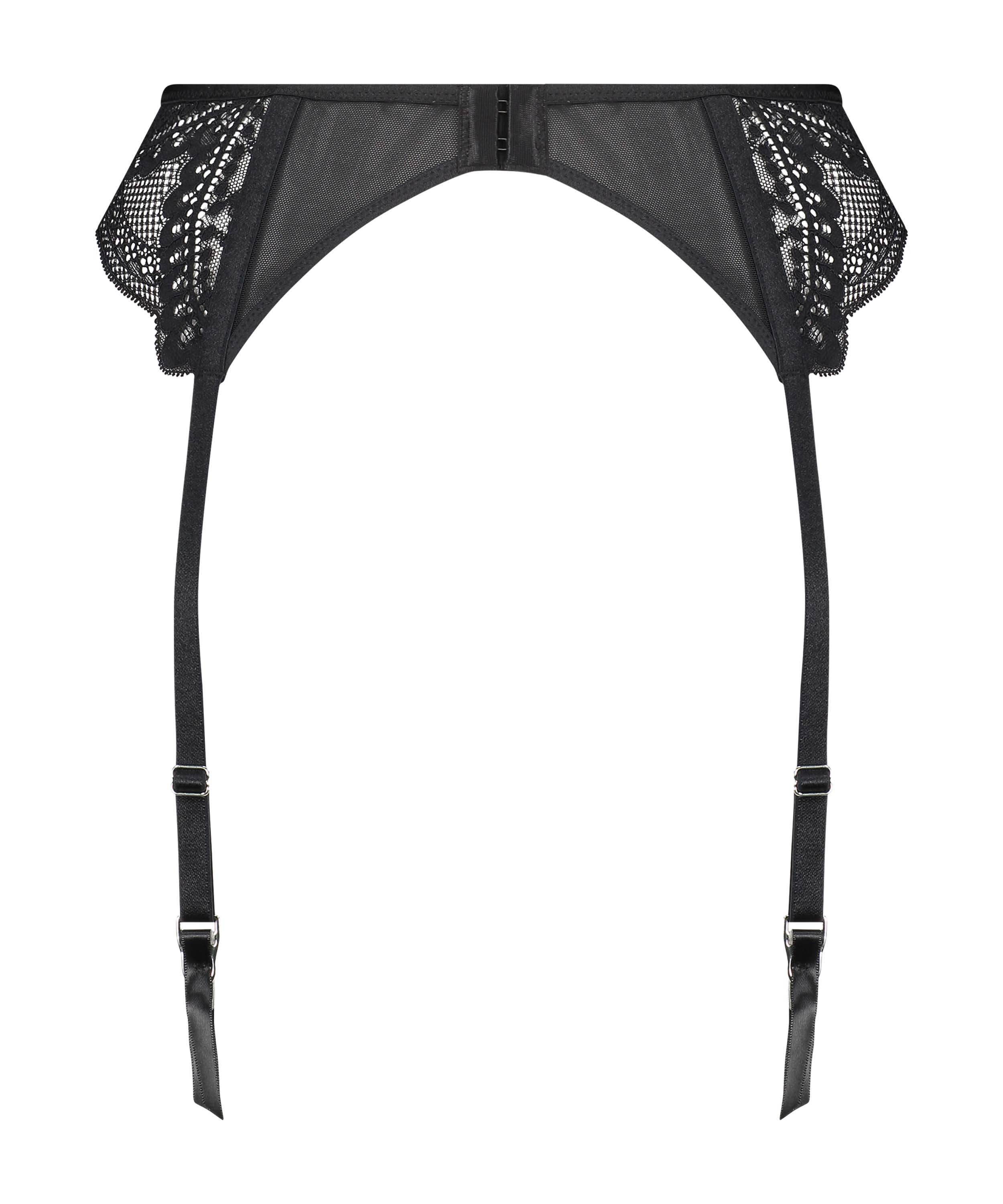 Esto completa tu conjunto de lencería. Este liguero está hecho de un hermoso encaje y una malla semitransparente. Forma parte de la colección Rebecca Mir.