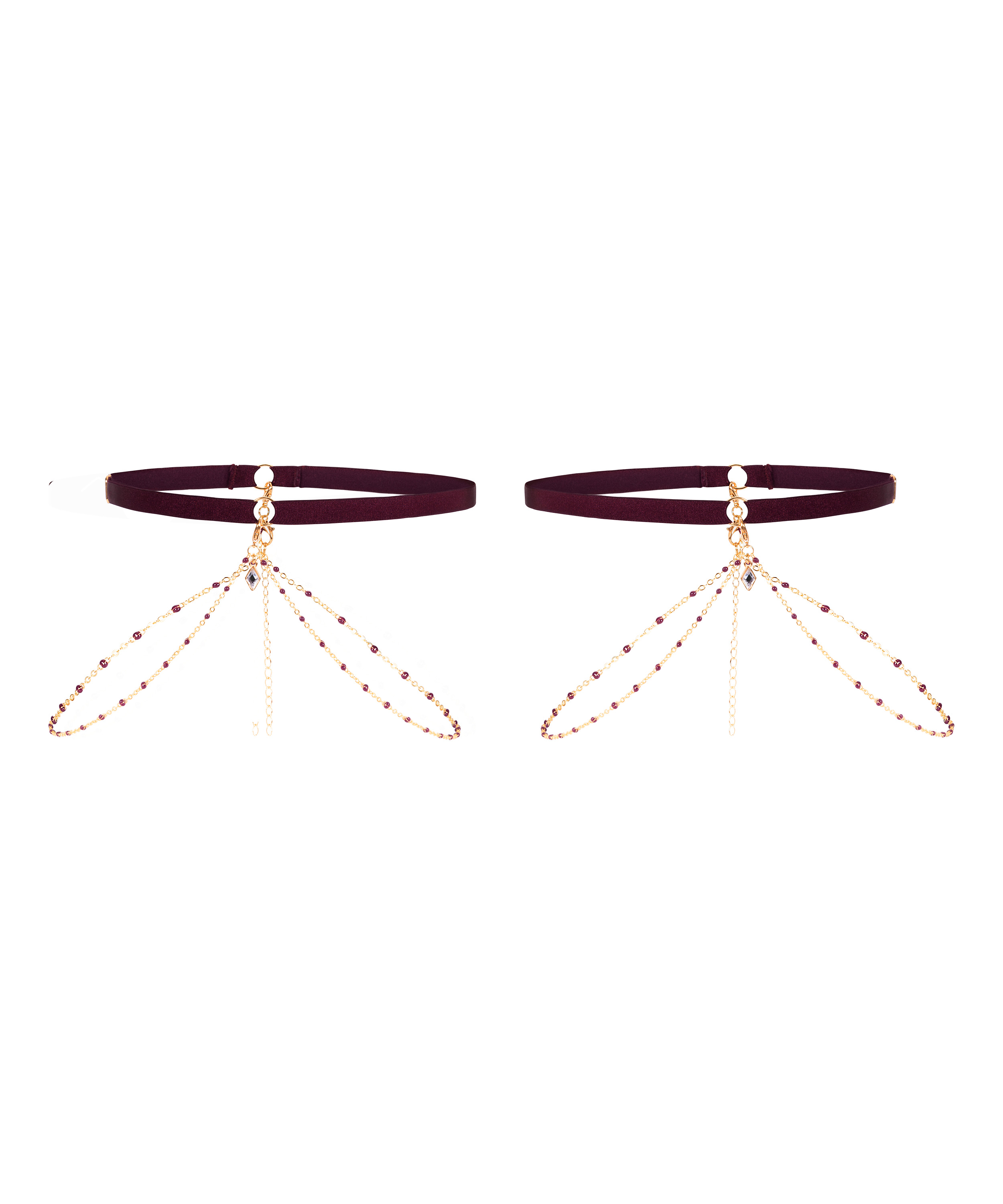 Añade un toque de glamour a tu look con estas impresionantes ligas para las piernas. Diseñados para sentarse cómodamente en el muslo, los ligueros cuentan con adornos de gemas que brillan a cada paso. Ya sea con lencería o como accesorio, estos ligueros aportan la mezcla perfecta de feminidad y vanguardia.