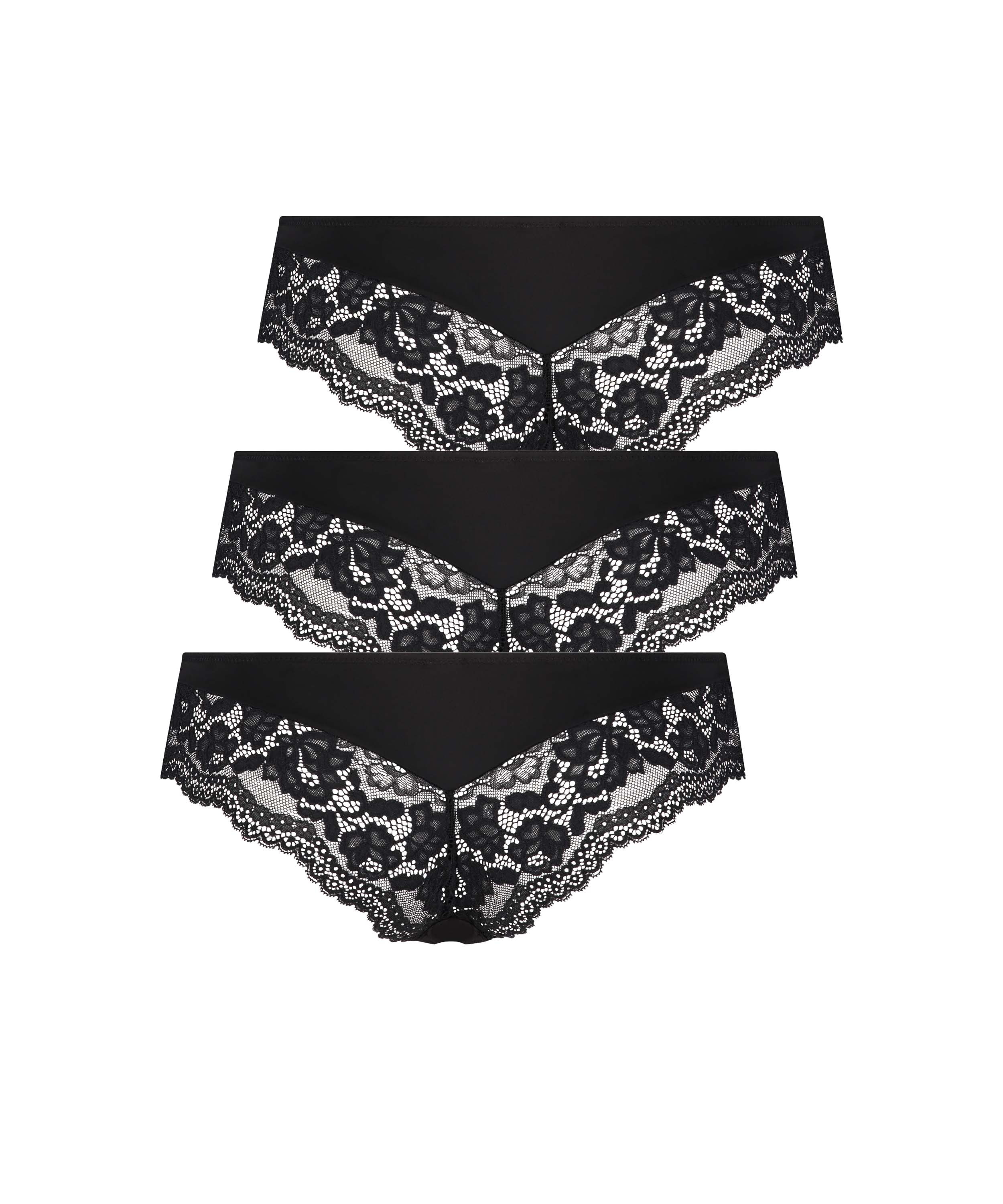 ¿Verdad que es bonita esta braguita brasileña? Tiene mucho encaje y un bonito lacito en la parte delantera. ¡Viene en práctico lote de 3 unidades!