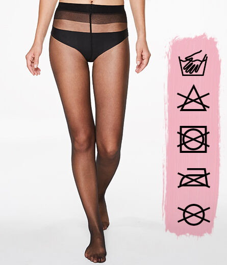 Las mismas instrucciones de lavado se aplican para las stay ups, stockings y pantis. Puedes lavar éstas en una bolsa de lavado con un máximo de 30 grados. No deberías meter tus medias en la secadora, ni blanquearlas ni plancharlas ni limpiarlas con productos químicos por profesionales de tintorerías.