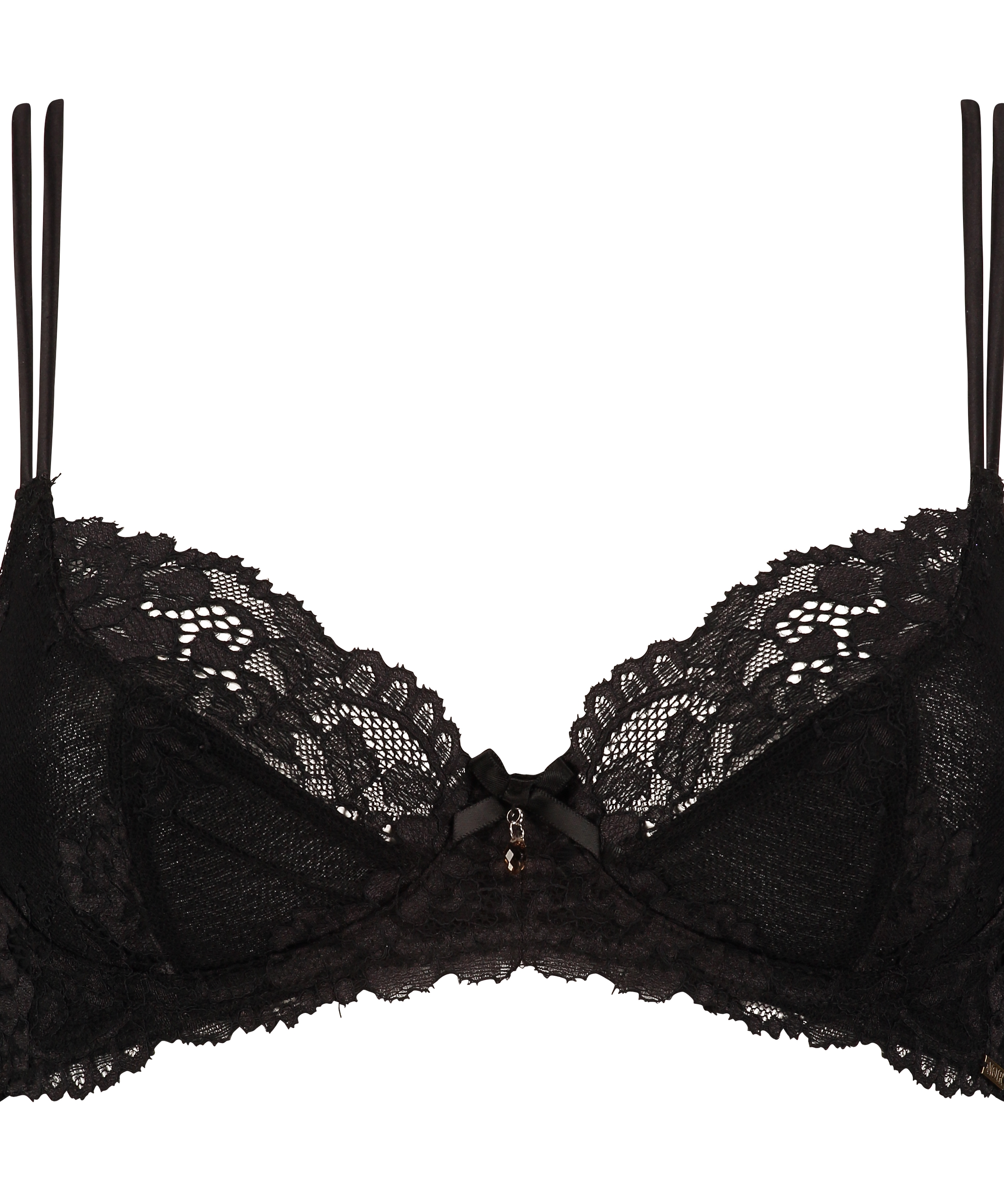 This elegant non-padded underwired bra from the Hunkemöller Noir collection is made from luxurious semi-transparent black lace. The bra has double shoulder straps and a small diamante between the cups.