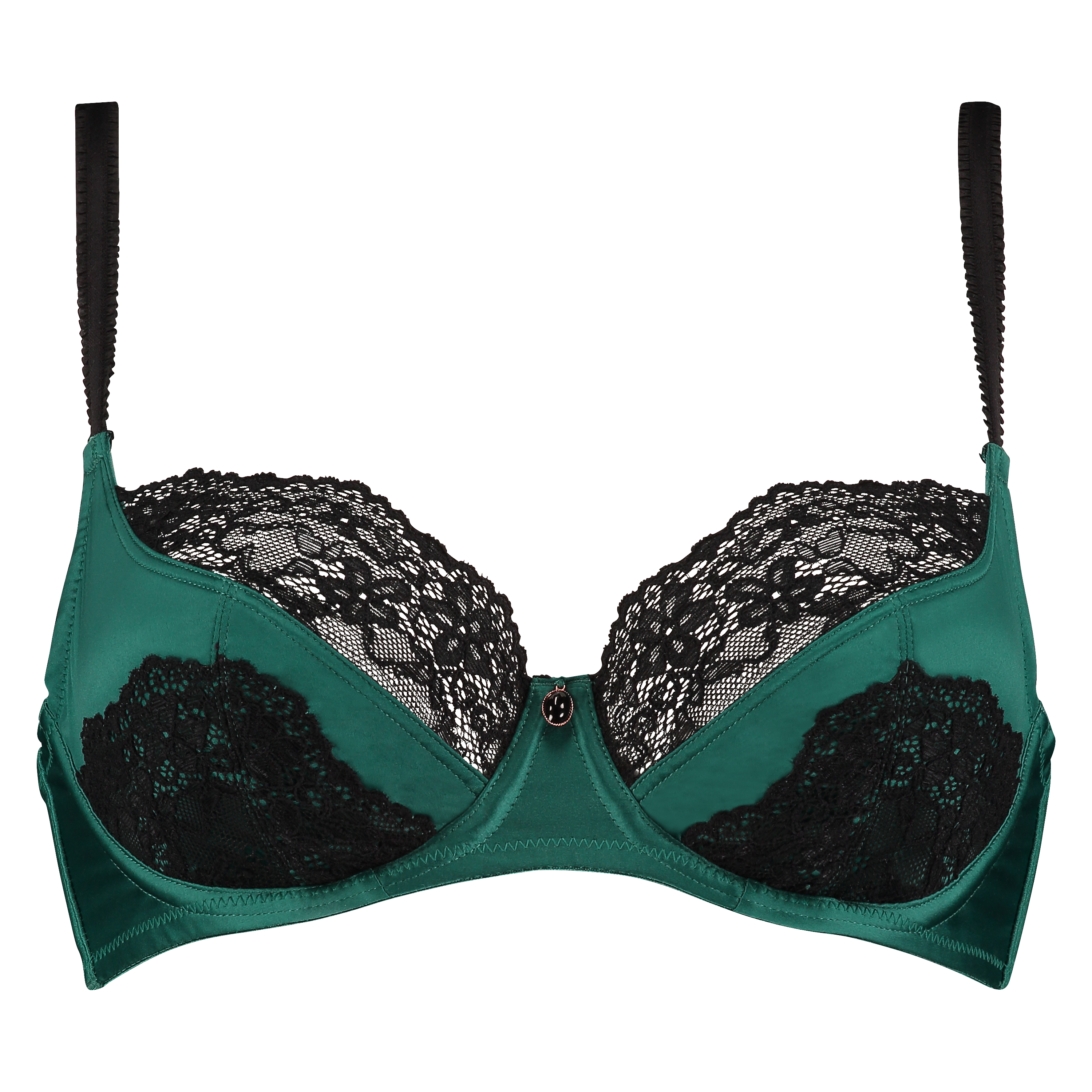 This bra is a dark green colour. The non-padded underwired cups are finished with black lace. The shoulder straps are made from crinkled fabric. A small black bow between the cups adds a finishing touch.