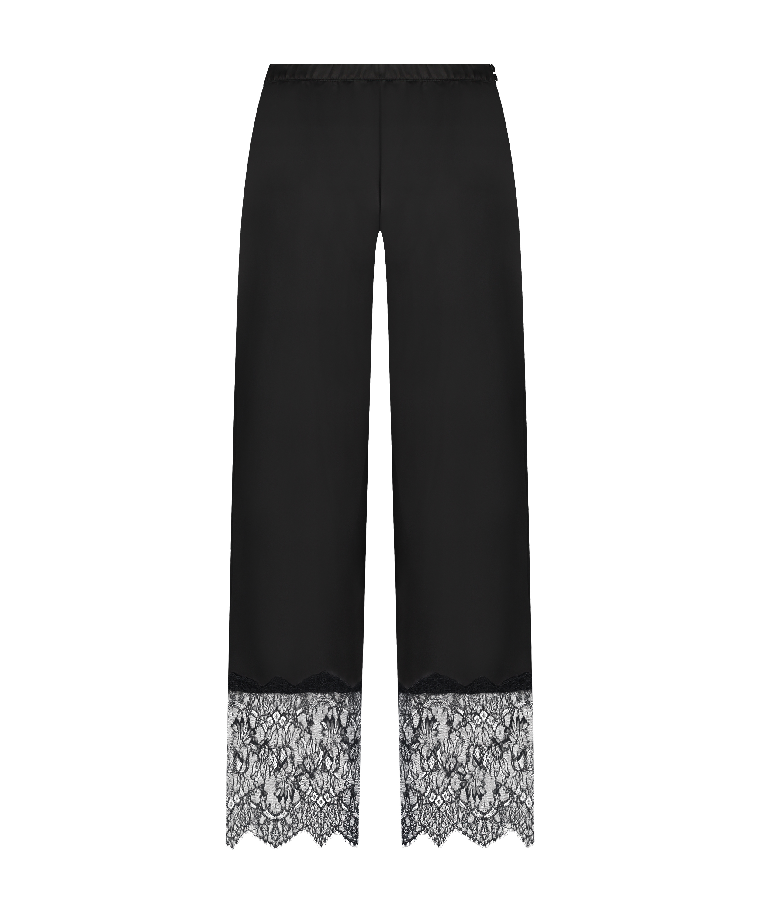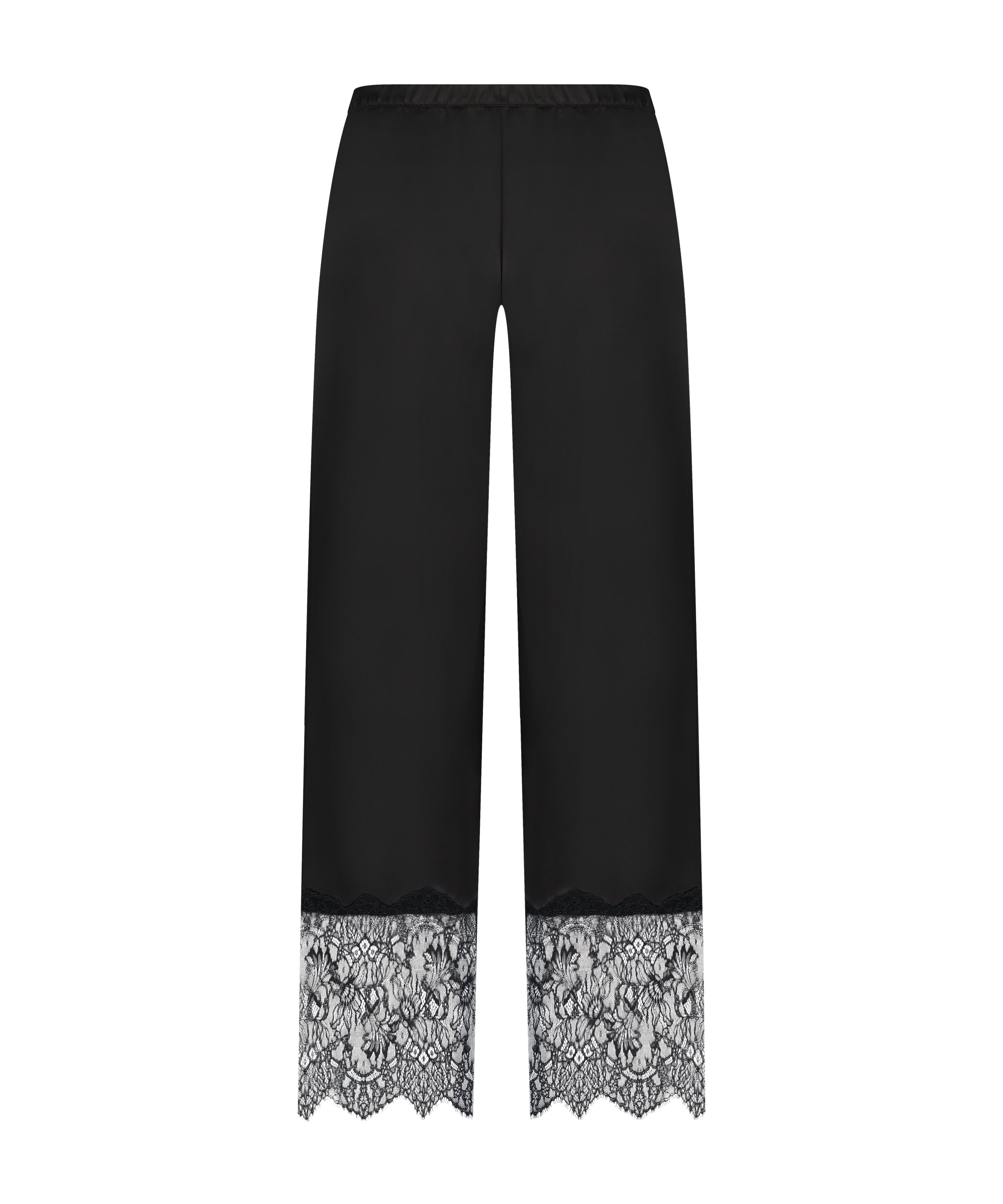 Lleve las noches acogedoras a un nuevo nivel con estos pantalones súper bonitos. Confeccionado con un tejido satinado supersuave y fluido, y un look de pierna ancha para que te sientas cómodo. Está decorado con puntilla romántica en la parte inferior. ¡Combina estos hermosos pantalones con la camiseta y el kimono a juego!