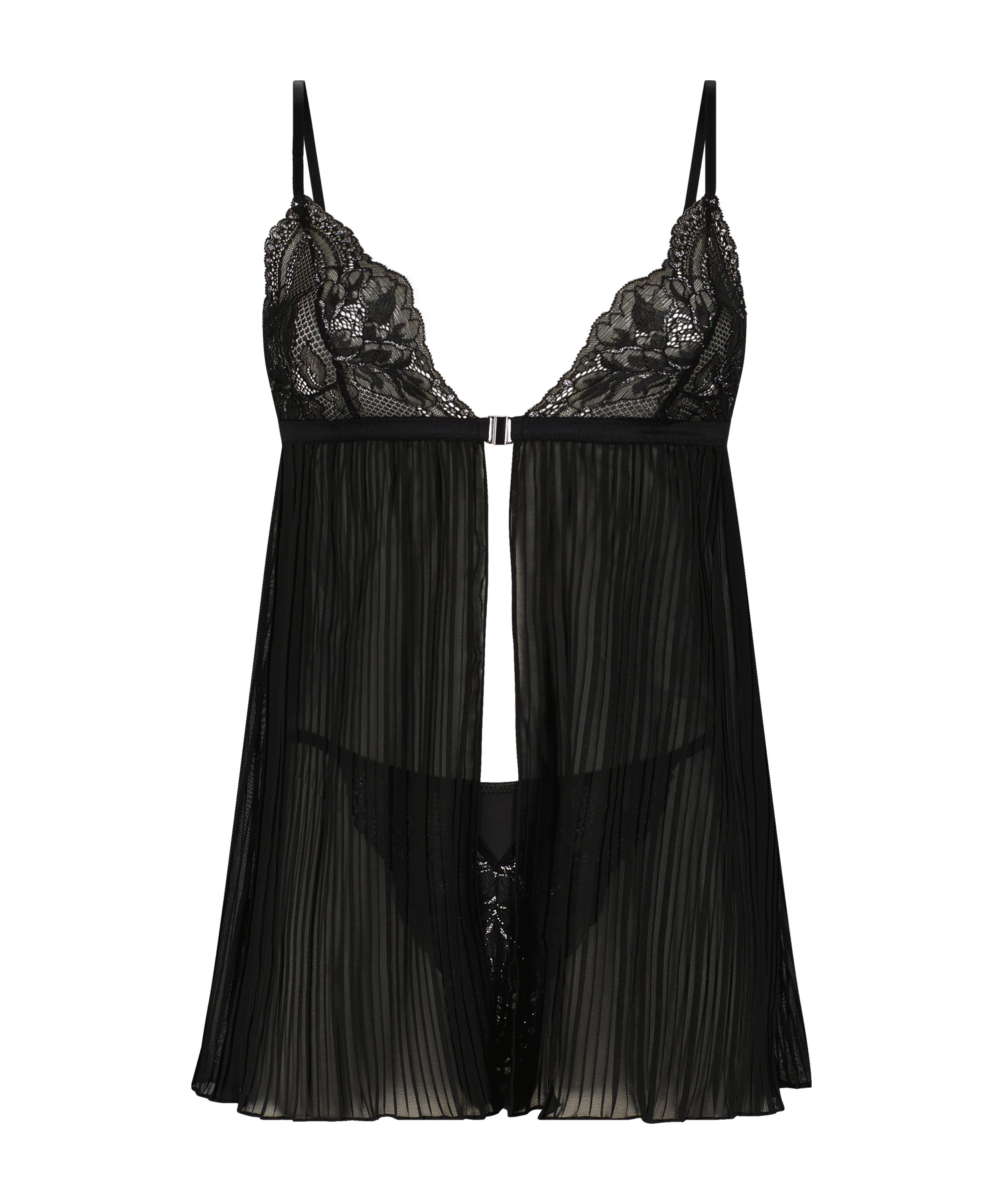 ¡Lleva un poco de glamur a tu colección de lencería con este precioso picardías de encaje! El lujoso encaje con detalles plateados y los tirantes ajustables hacen de este sexi picardías una prenda de ensueño. Tiene un cierre frontal y viene con una braguita brasileña a juego.