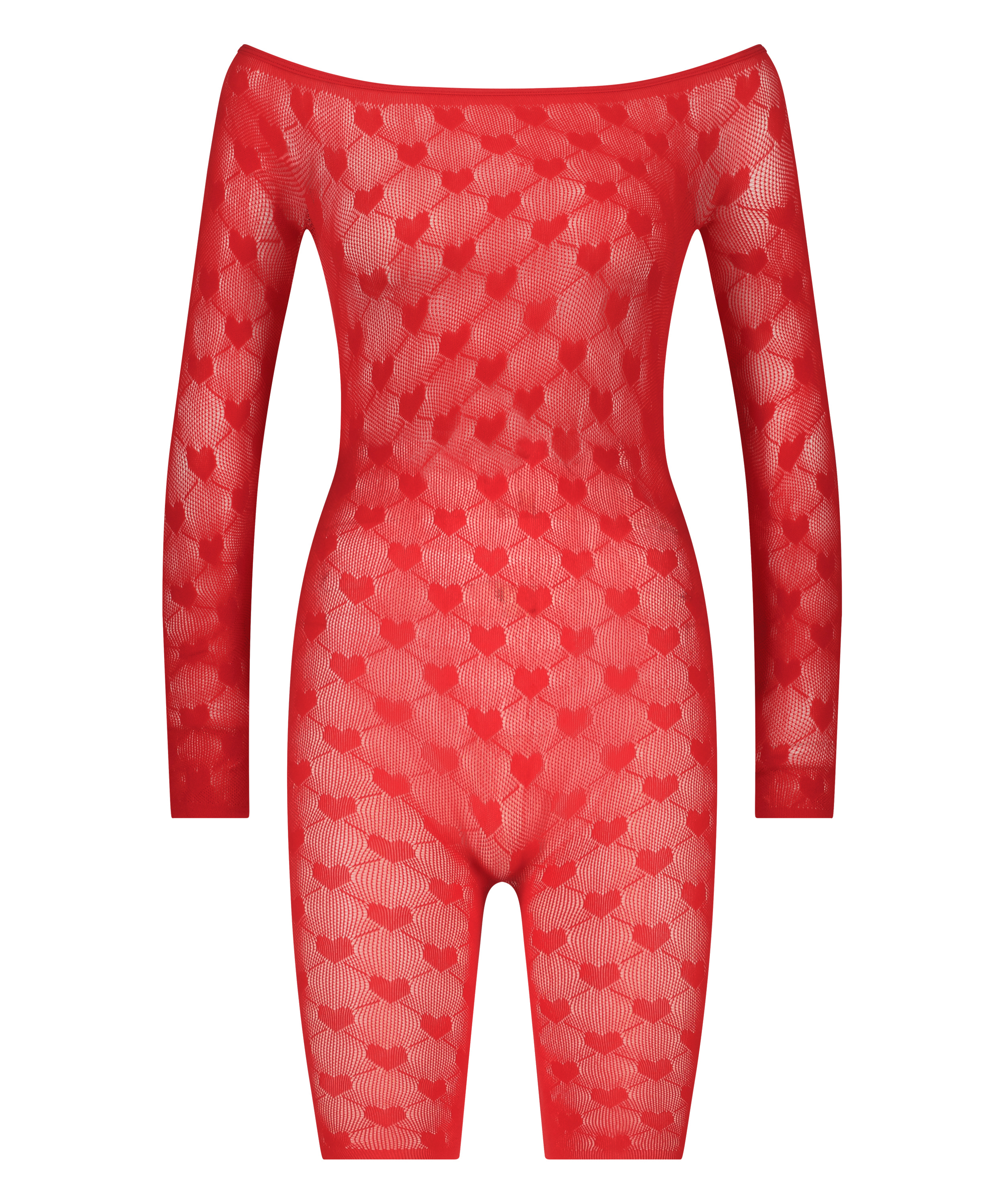 ¡Siéntete romántica con este bonito mono de corazón! Un look semitransparente con bordados de corazón en toda la prenda. Supercómodo con mangas largas y pantalones cortos. Forma parte de la colección Private.