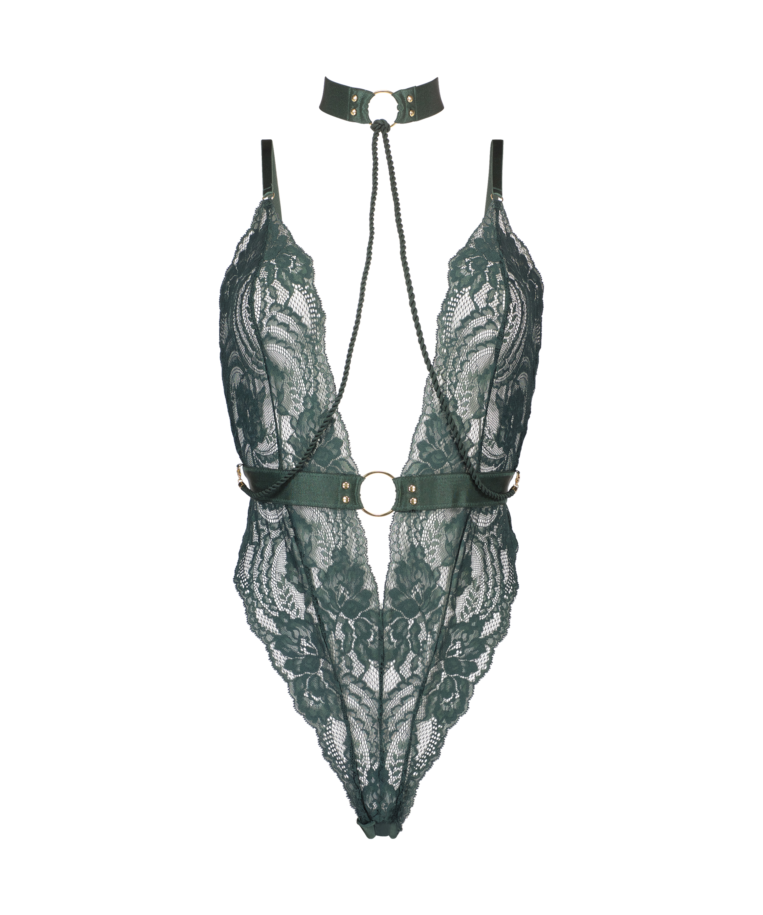¡Siéntete seductora en este body de encaje! Tiene una gargantilla con símil de cuero y está terminada con un cordón elástico que está torcido. ¡La parte posterior queda bastante abierta y tiene un corte desinhibido y supersexi! Parte de la emocionante colección Private.