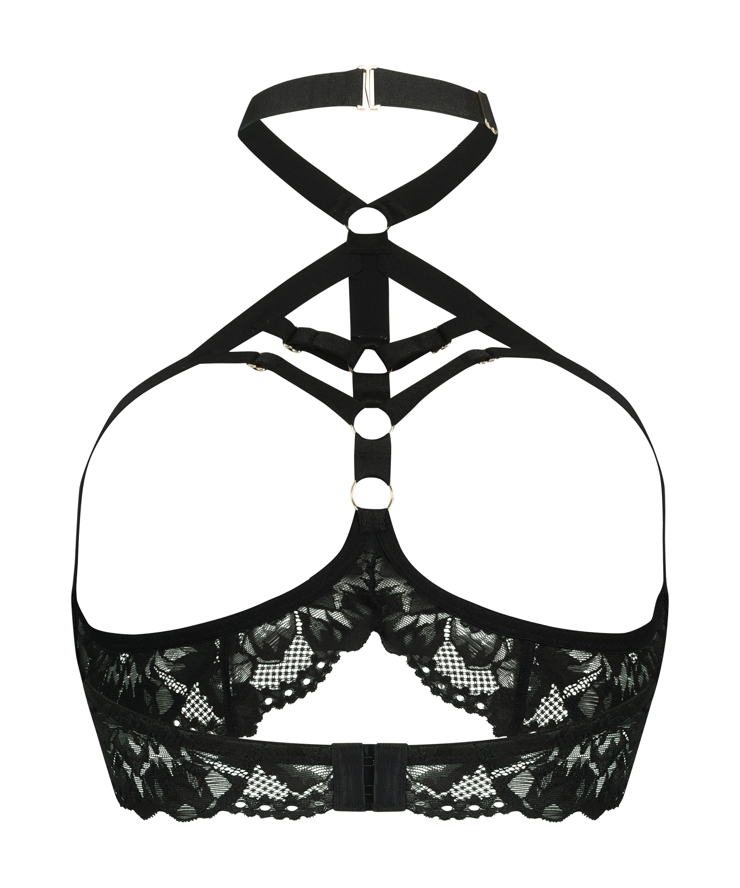 ¡Dale un toque picante a las cosas con este bralette supersexi! Presenta muchos detalles de encaje y tiras por todas partes. Parte de nuestra colección privada.
