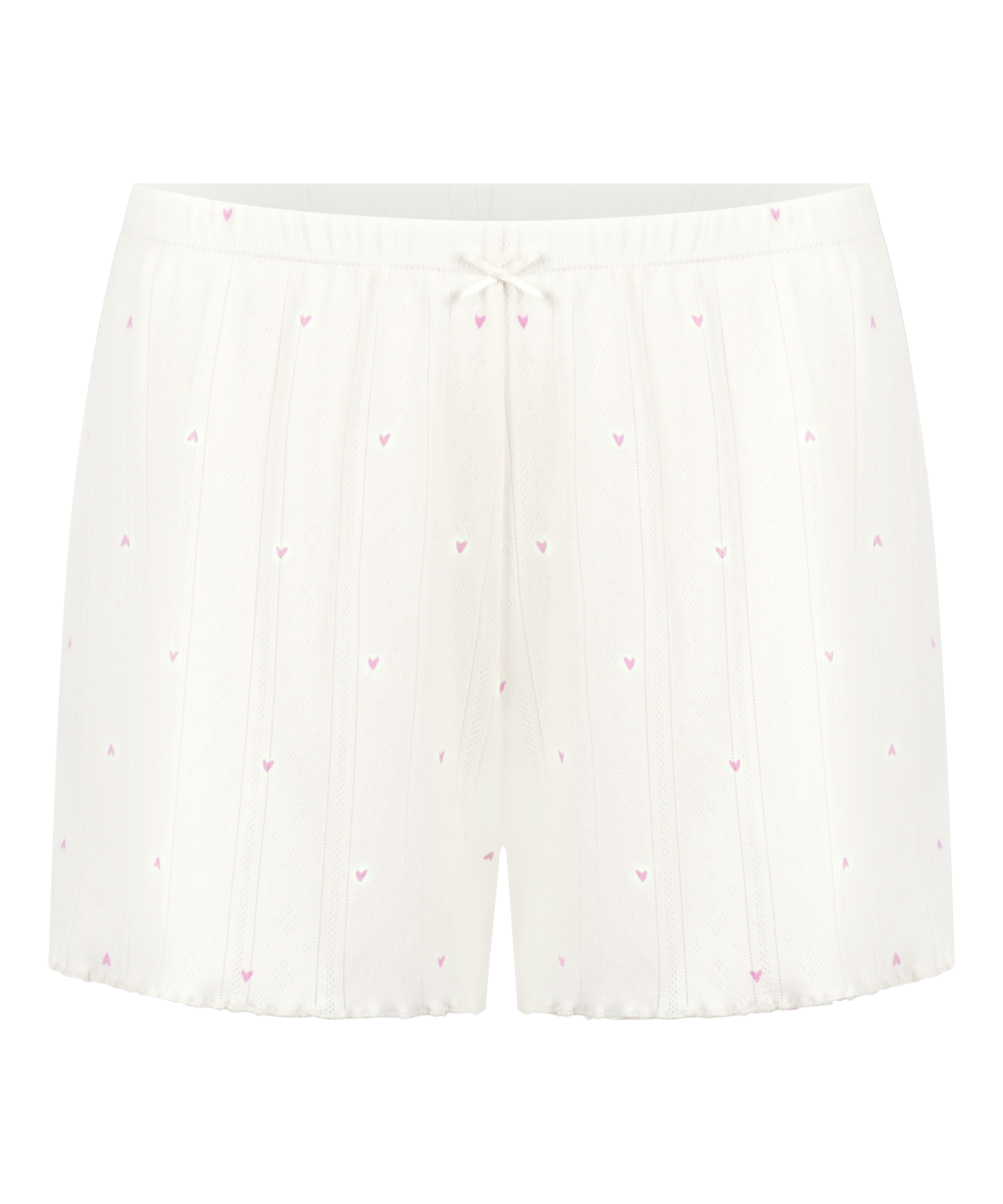 ¿Buscas los shorts de estar por casa más bonitos del mundo? Estos shorts de algodón pointelle tienen un diseño de corazoncitos por todas partes y un dobladillo ondulado con borde de lechuga que le da un toque muy femenino. Suaves, transpirables y monísimos, son perfectos para las noches cálidas o para descansar con estilo. ¿Quieres el look completo? Se puede combinar con su top de pointelle a juego.