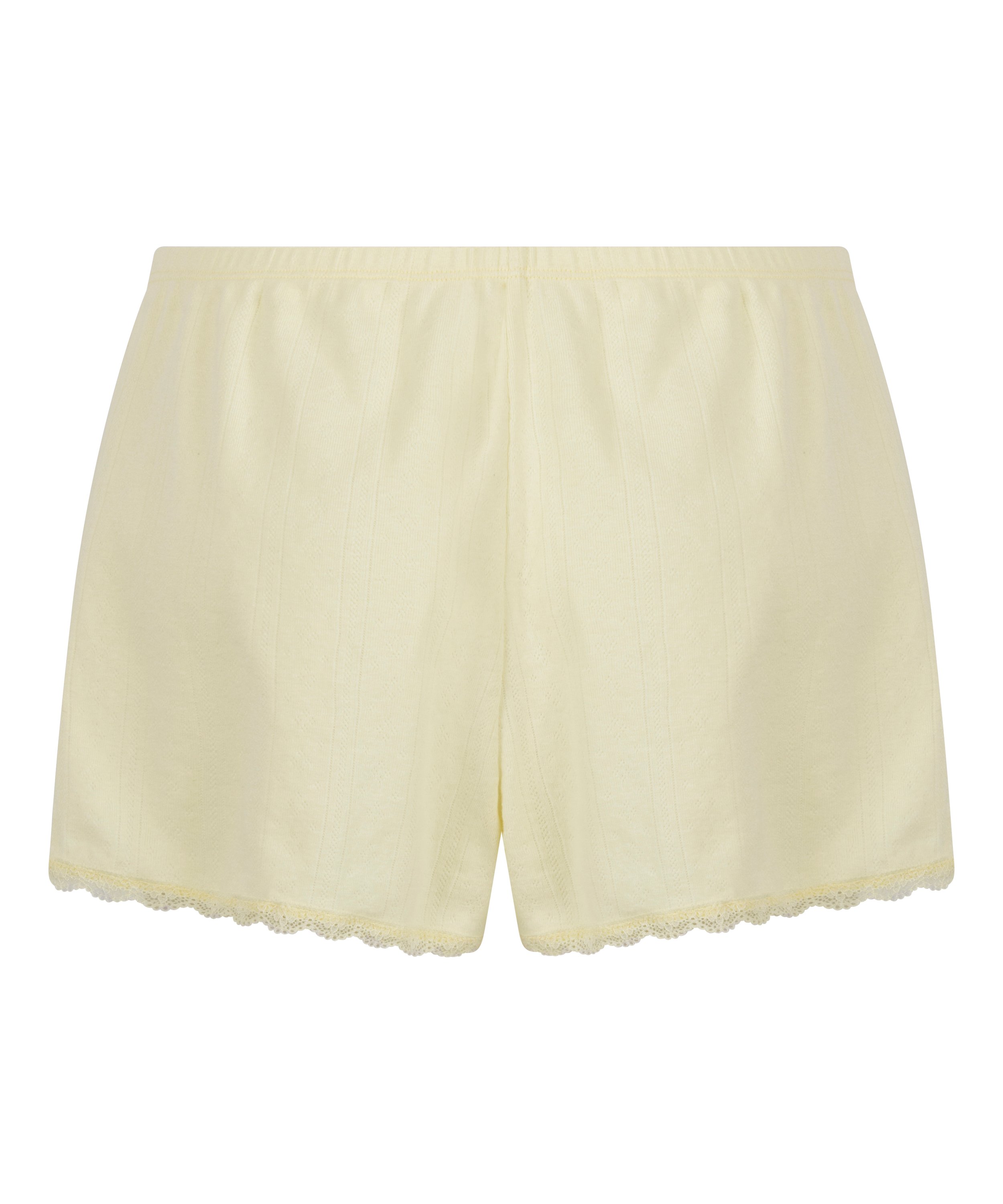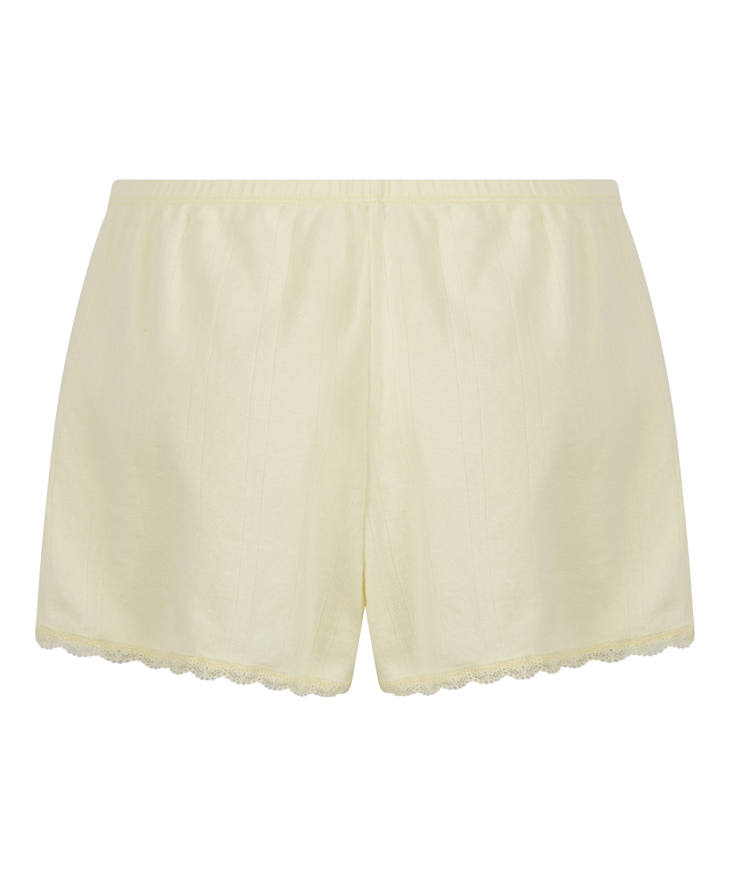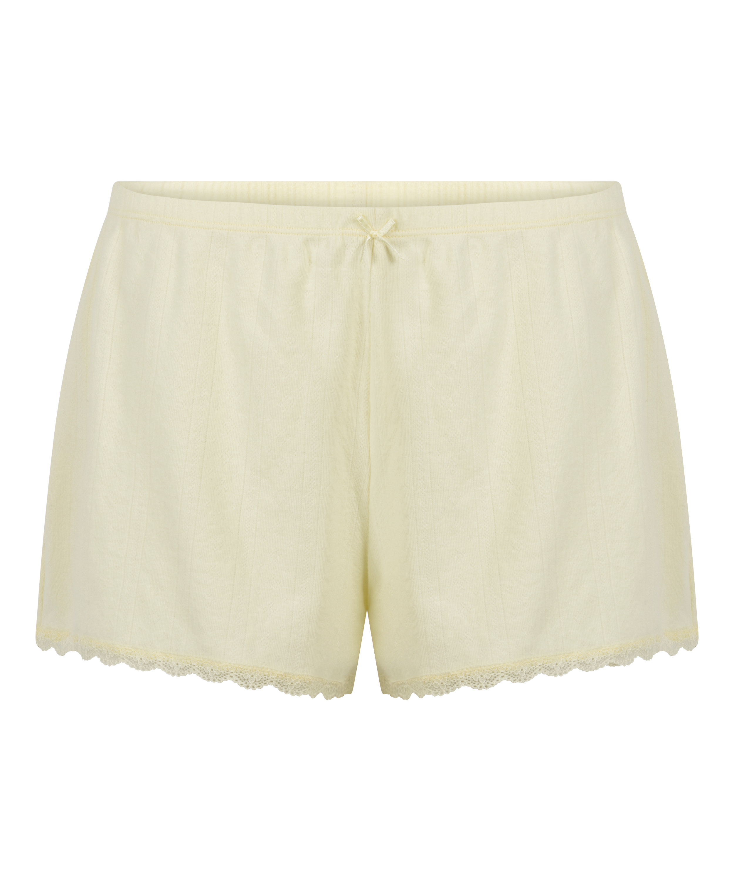 Disfruta de la comodidad con todo el estilo con nuestro short. Este short está confeccionado en suave tejido pointelle y presenta un patrón texturizado que aporta un toque a tu ropa de estar en casa. Los detalles de encaje realzan la prenda, mientras la cintura elástica garantiza un ajuste seguro y cómodo.