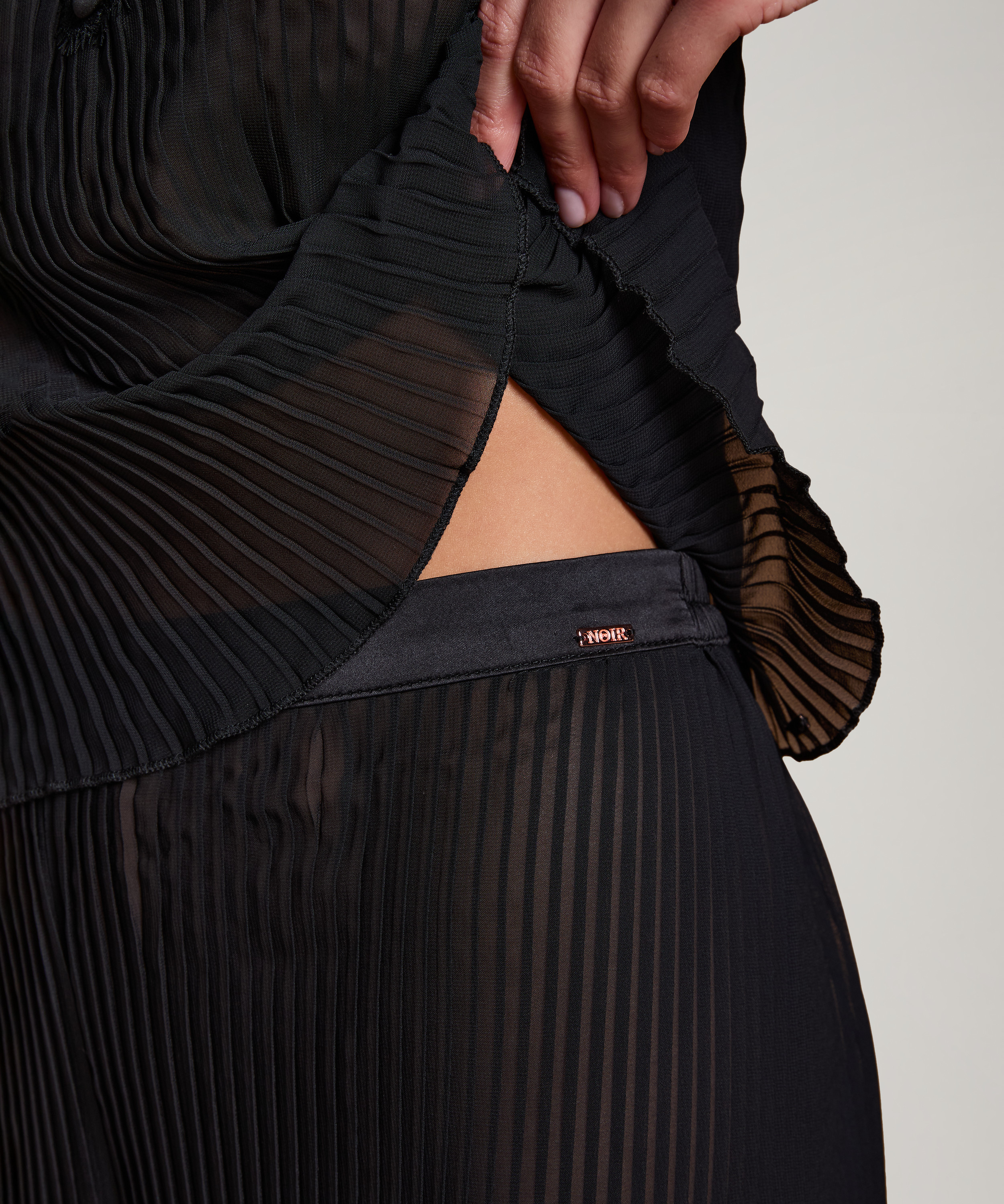 Adéntrate en la elegancia sin esfuerzo con este elegante pantalón de noche. Su cintura elástica fruncida ofrece un ajuste cómodo, mientras que el tejido plisado aporta clase. Confeccionado en un material ligero y ligeramente transparente, dispone de una caída perfecta y un aspecto sofisticado.