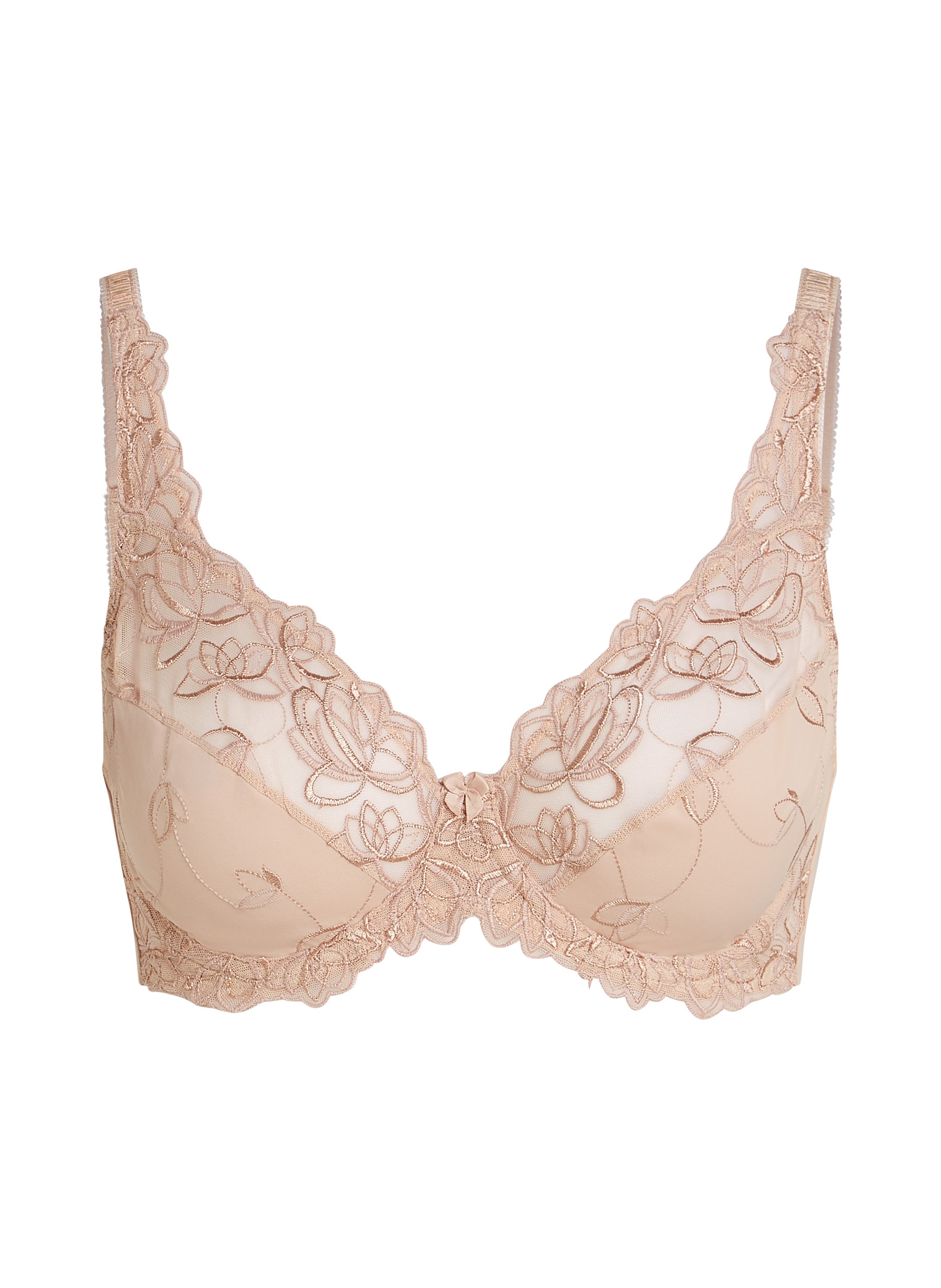 Este sujetador de aros no preformado es de un tejido opaco y tiene un acabado de encaje semitransparente en la parte superior. Las copas están decoradas con un elegante estampado floral. Completa tu conjunto de lencería con la correspondiente braguita modelo Diva.