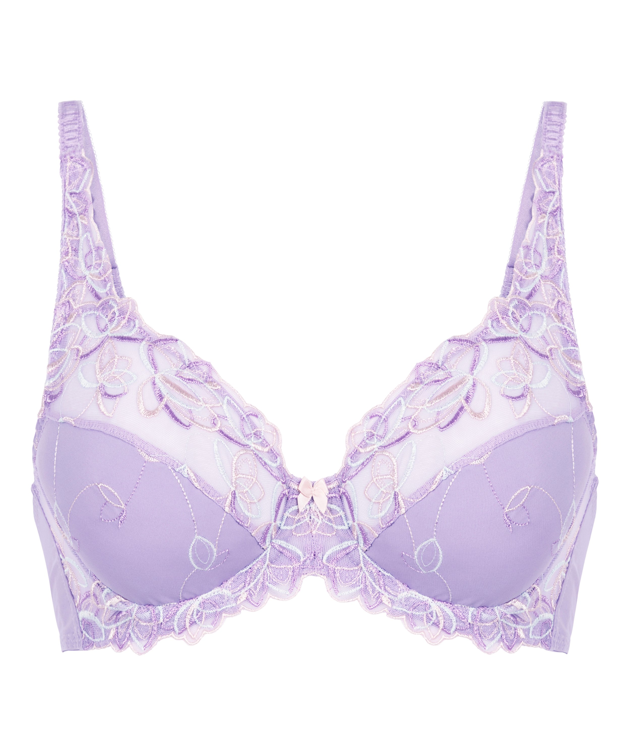 Este sujetador de aros no preformado es de un tejido opaco y tiene un acabado de encaje semitransparente en la parte superior. Las copas están decoradas con un elegante estampado floral. Completa tu conjunto de lencería con la correspondiente braguita modelo Diva.