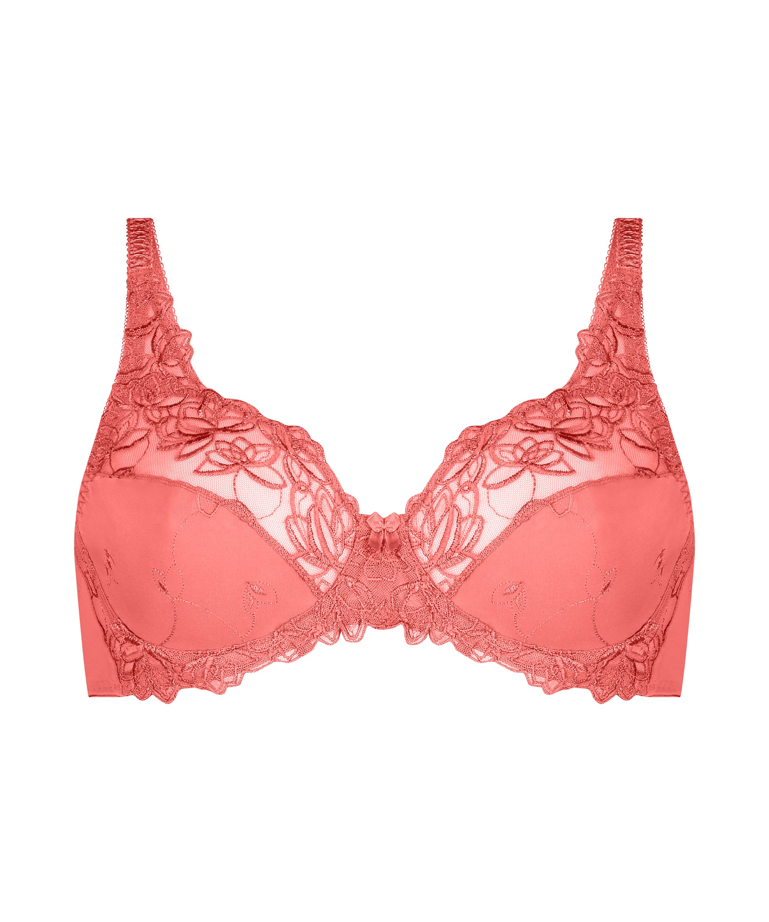 Este sujetador de aros no preformado es de un tejido opaco y tiene un acabado de encaje semitransparente en la parte superior. Las copas están decoradas con un elegante estampado floral. Completa tu conjunto de lencería con la correspondiente braguita modelo Diva.