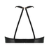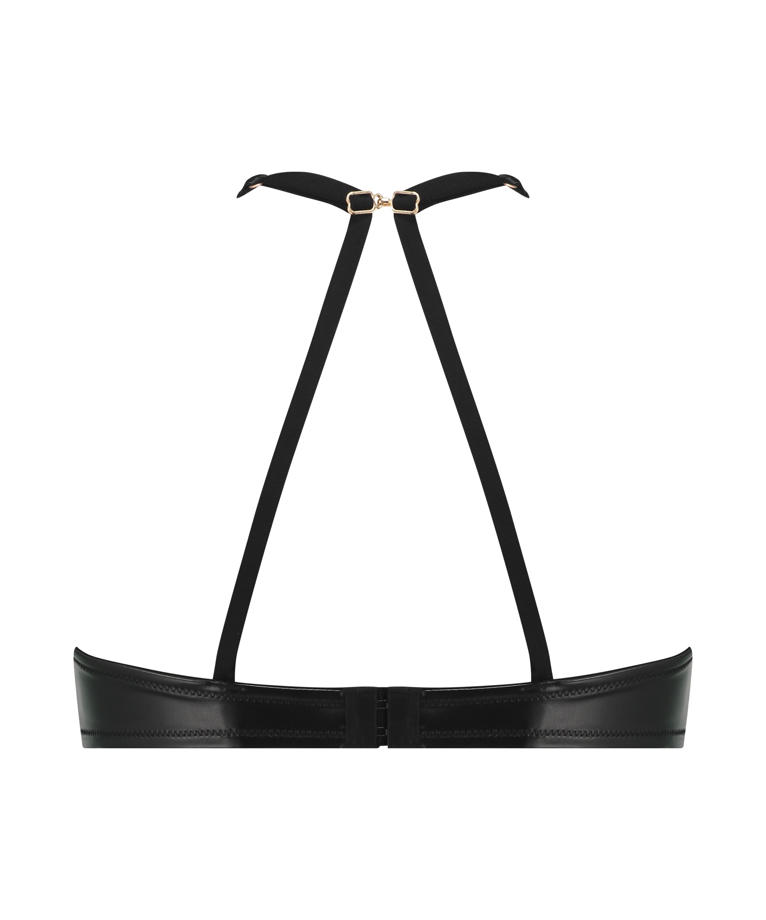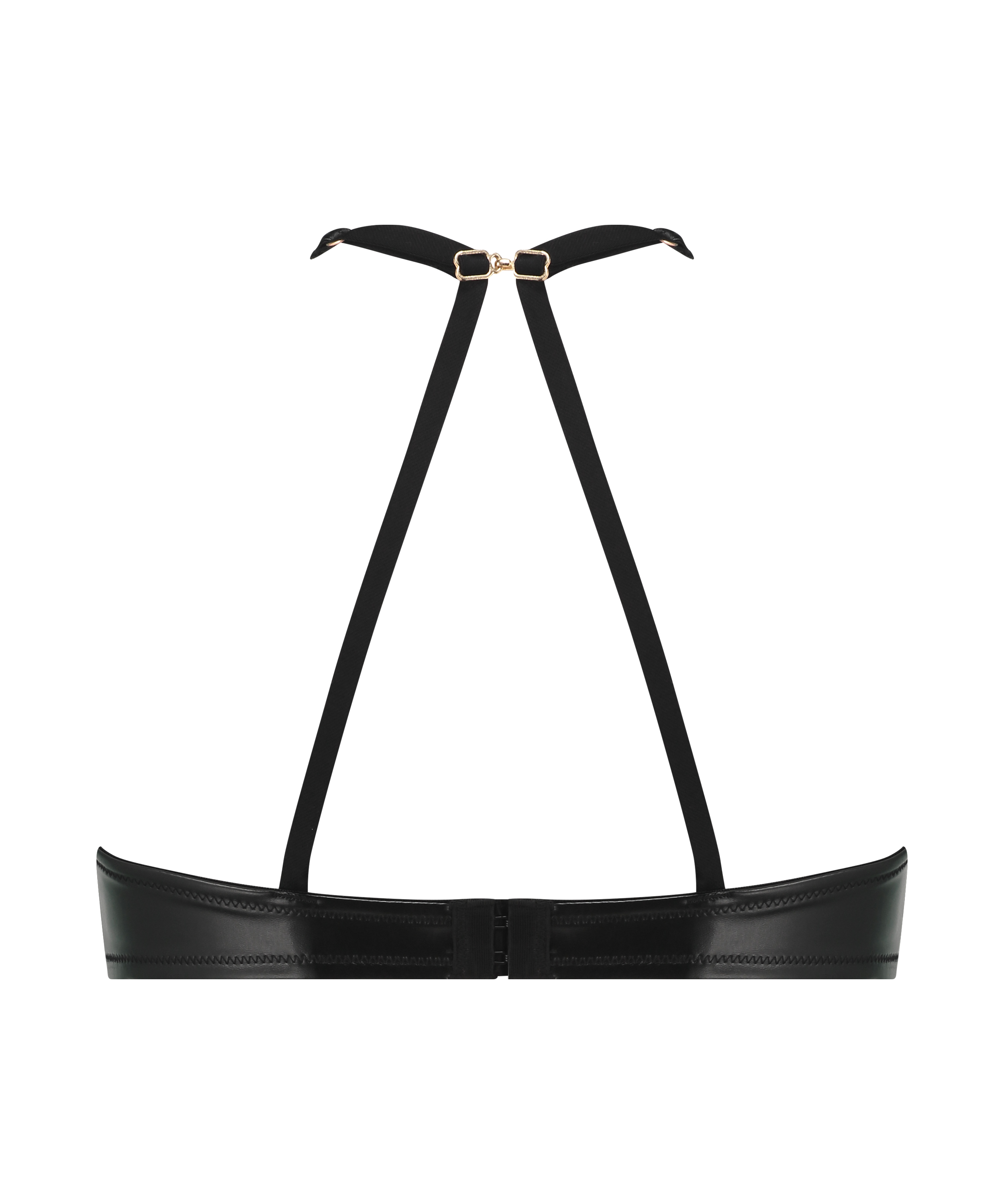 Este sujetador presenta un diseño elegante en piel sintética negra con delicados detalles dorados. El escote pronunciado ofrece un toque atrevido, mientras que las correas ajustables aseguran un ajuste personalizado. Las copas con aros proporcionan apoyo y forma. El sujetador está diseñado para realzar tu figura y ofrecer un look glamuroso.