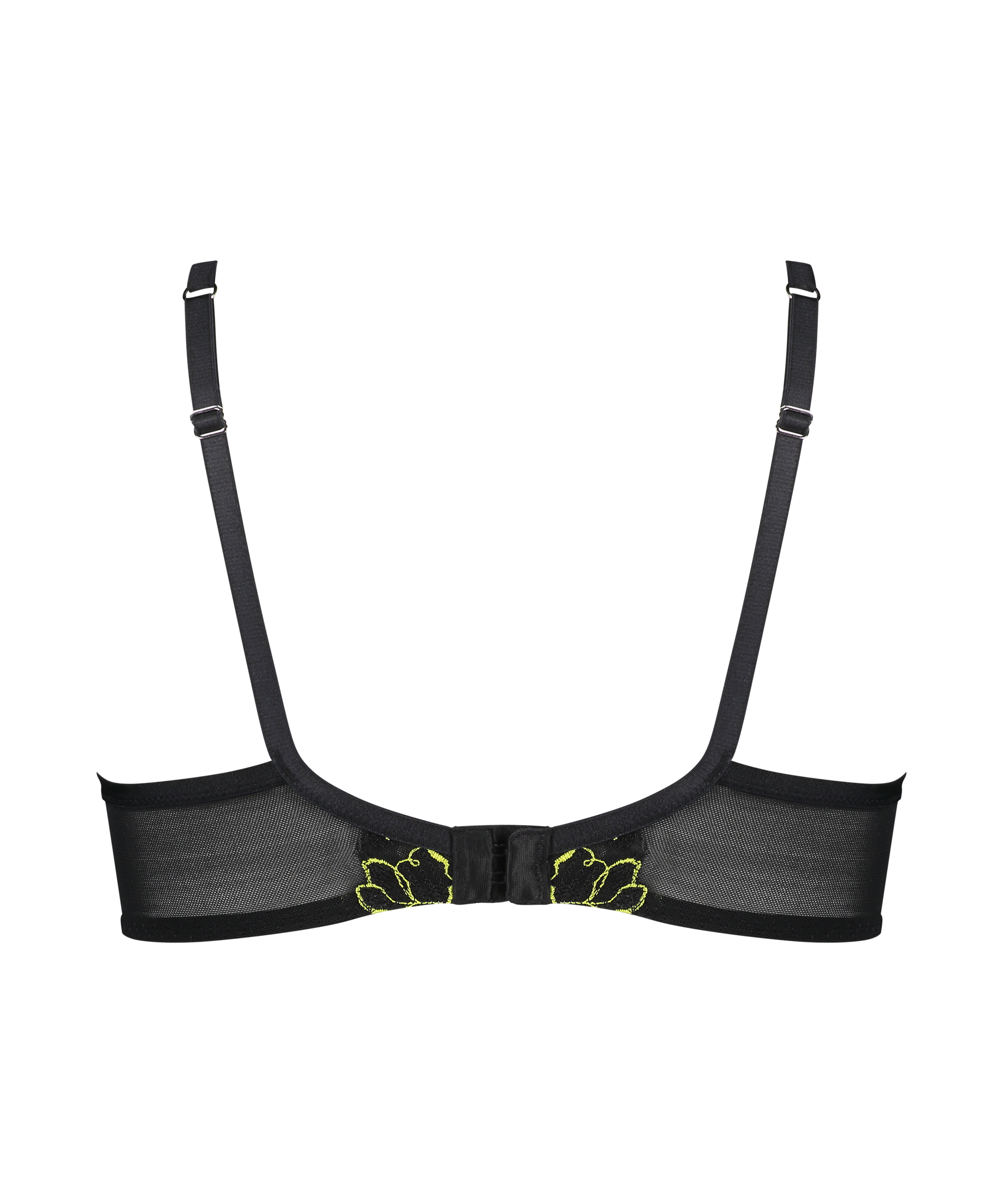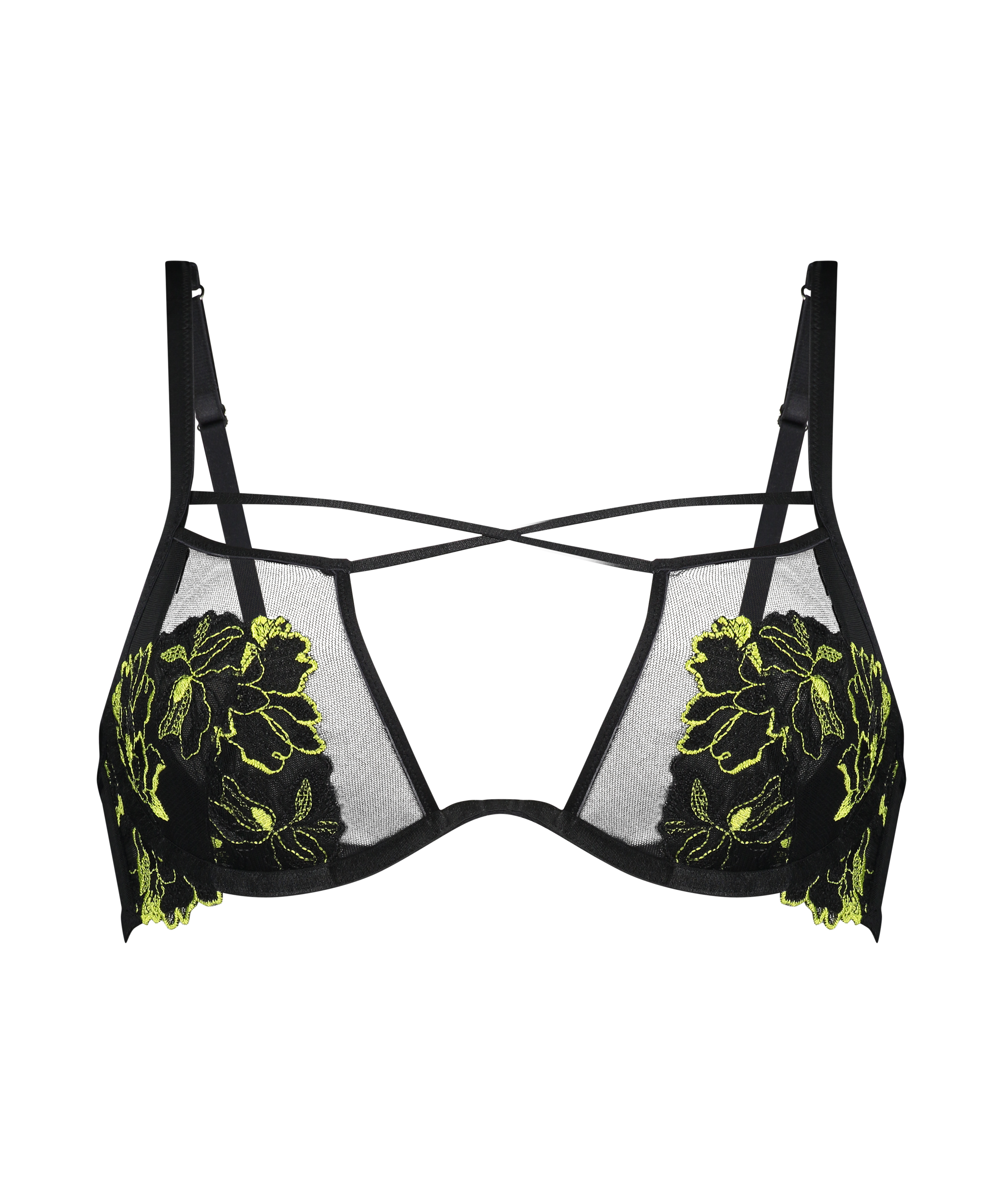 ¡Busca un fascinante conjunto de lencería con este sujetador! Elaborado de tiras y encaje semi-transparente.