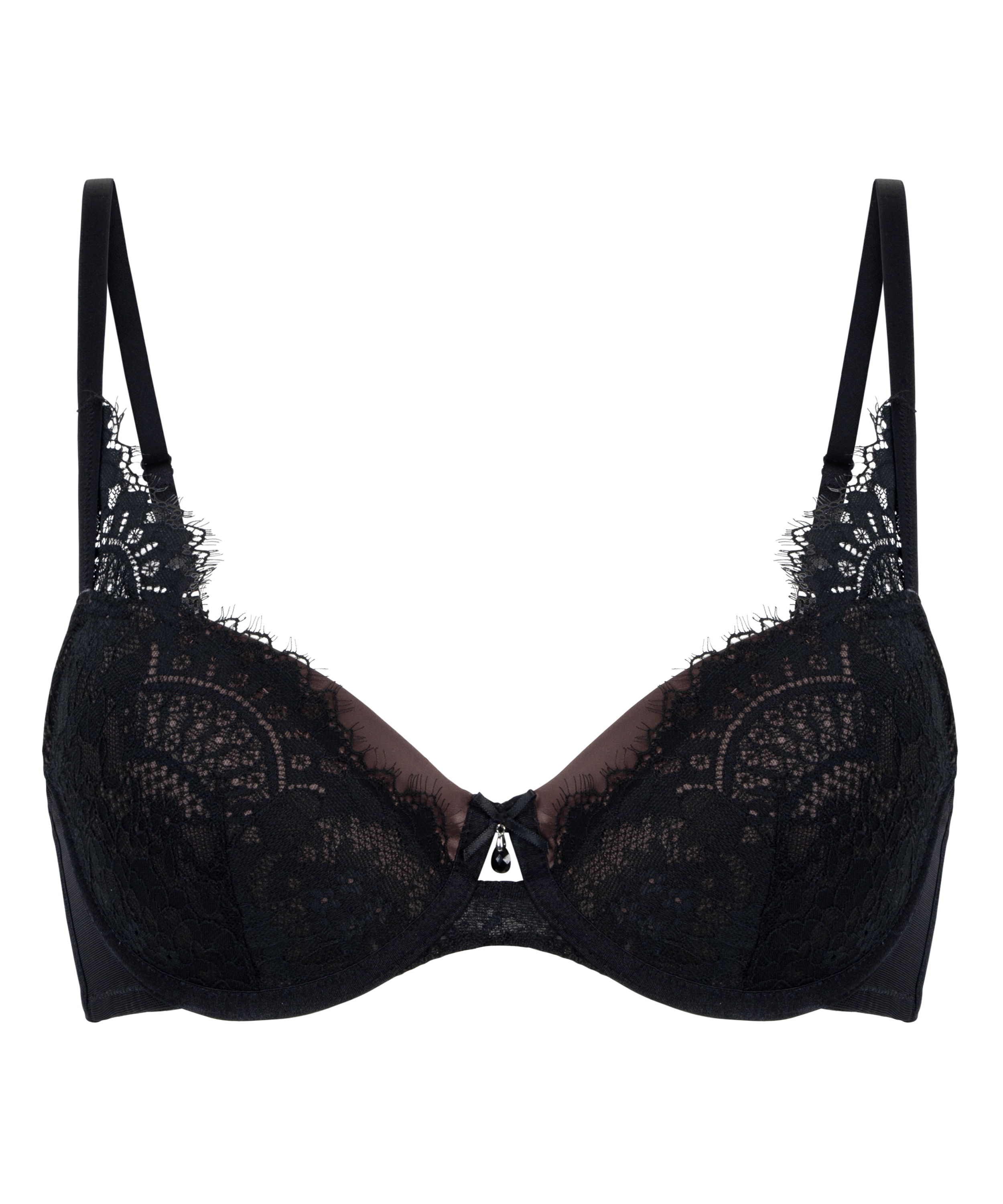 Siéntete irresistible con este increíblemente sexy sujetador con aros y relleno y detalles de encaje. Este sujetador tiene tirantes para llevarlo como quieras, una parte posterior de encaje y una bonita decoración de lazo con estrás. Apuesta por un conjunto impresionante y combínalo con ropa interior a juego para conseguir el look romántico definitivo.
