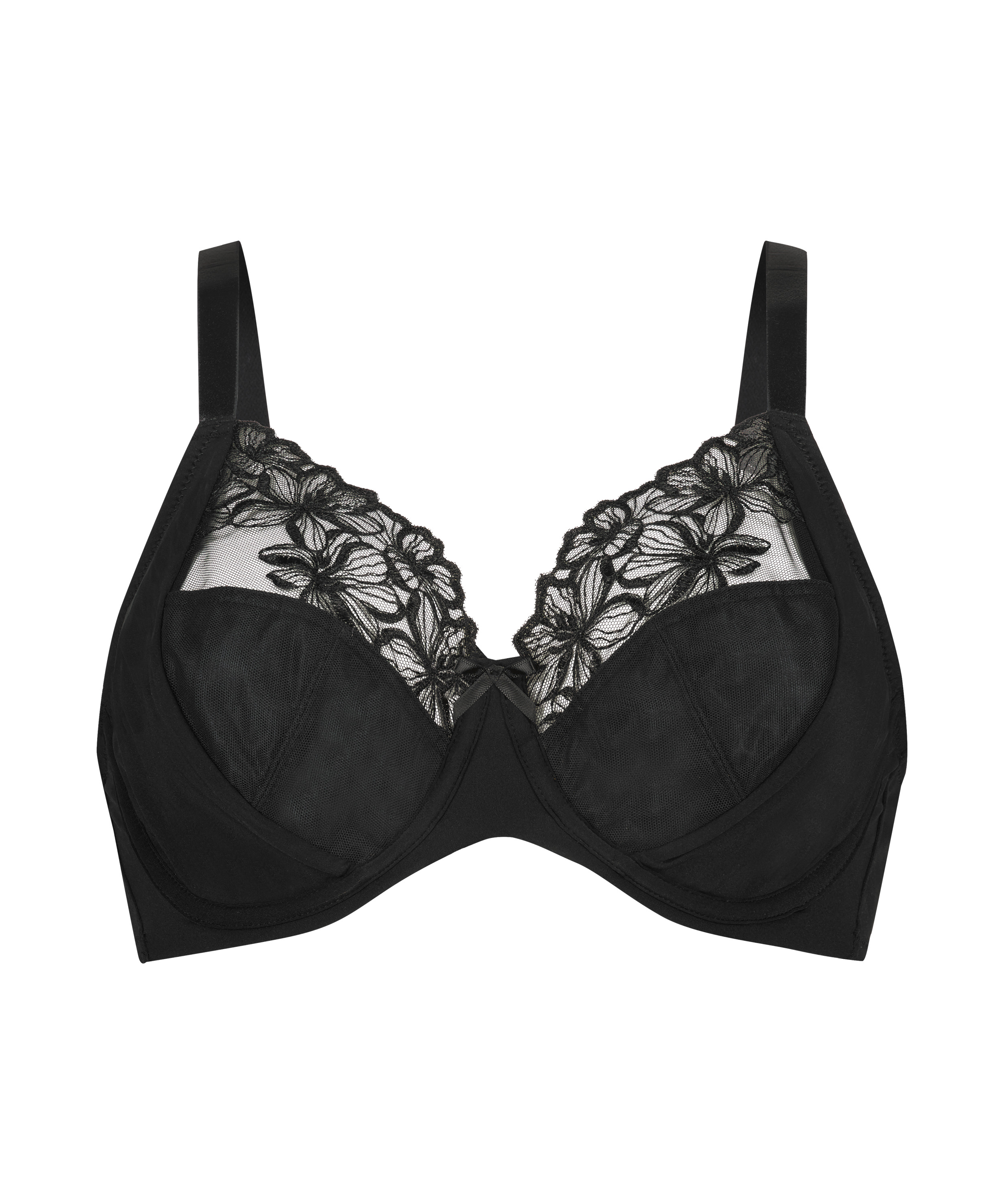Este sujetador de aros no preformado está fabricado con un tejido firme y está acabado en la parte superior con encaje semitransparente. Las copas están decoradas con un elegante estampado de flores. Completa el conjunto con las braguitas a juego.