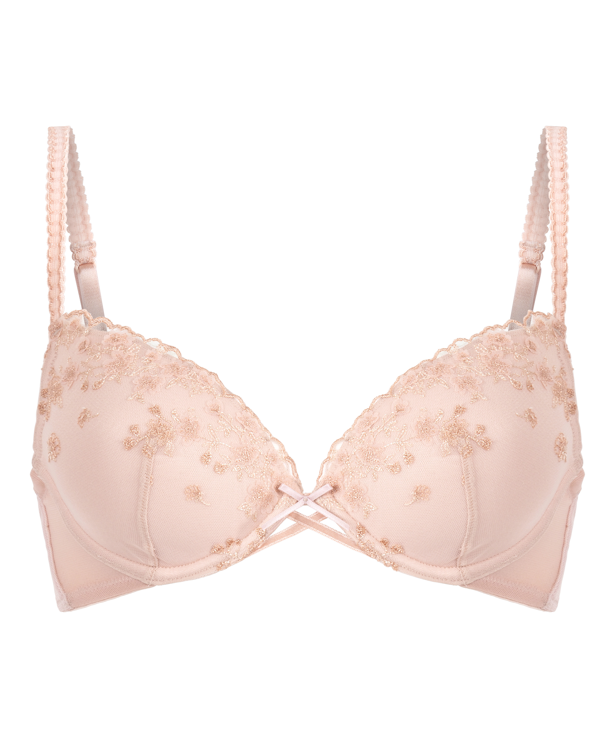 Resalta tu sensualidad con este sujetador push-up con relleno moldeador. El corte favorecedor realza tu forma natural con una sujeción que se eleva desde los laterales, no desde el centro. Acabado con un delicado encaje floral, aporta un toque romántico a tu cajón de lencería.