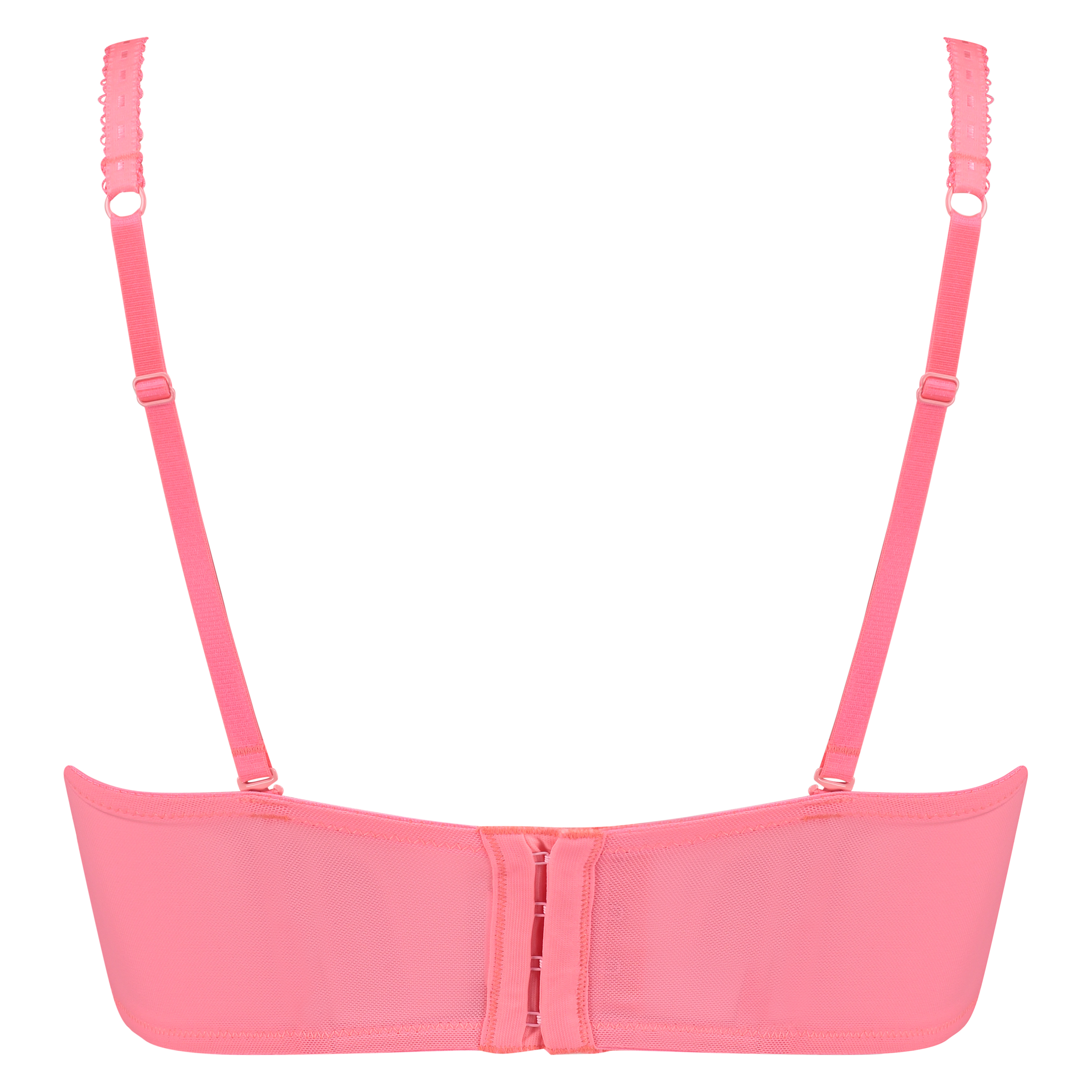 La primavera se siente: este sujetador de aros con relleno está compuesto de ligeras copas rosas cubiertas con encaje de color coral. Las partes de debajo y de en medio de las copas son de un encaje azul semitransparente. La parte trasera está hecha de un tejido de color azul claro semitransparente. Los ligeros pliegues rosas en los tirantes le añaden un toque final.