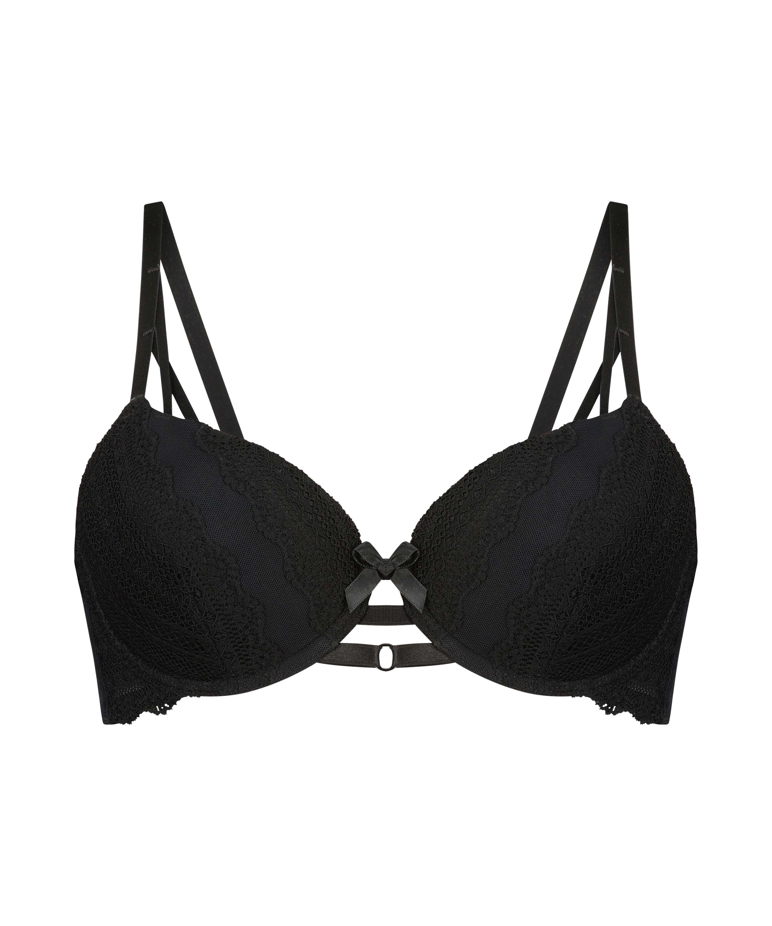 ¡Este sujetador debe ser tuyo! Tiene encaje y un bonito lazo entre las copas. Combina la braguita con prendas a juego para completar tu look.