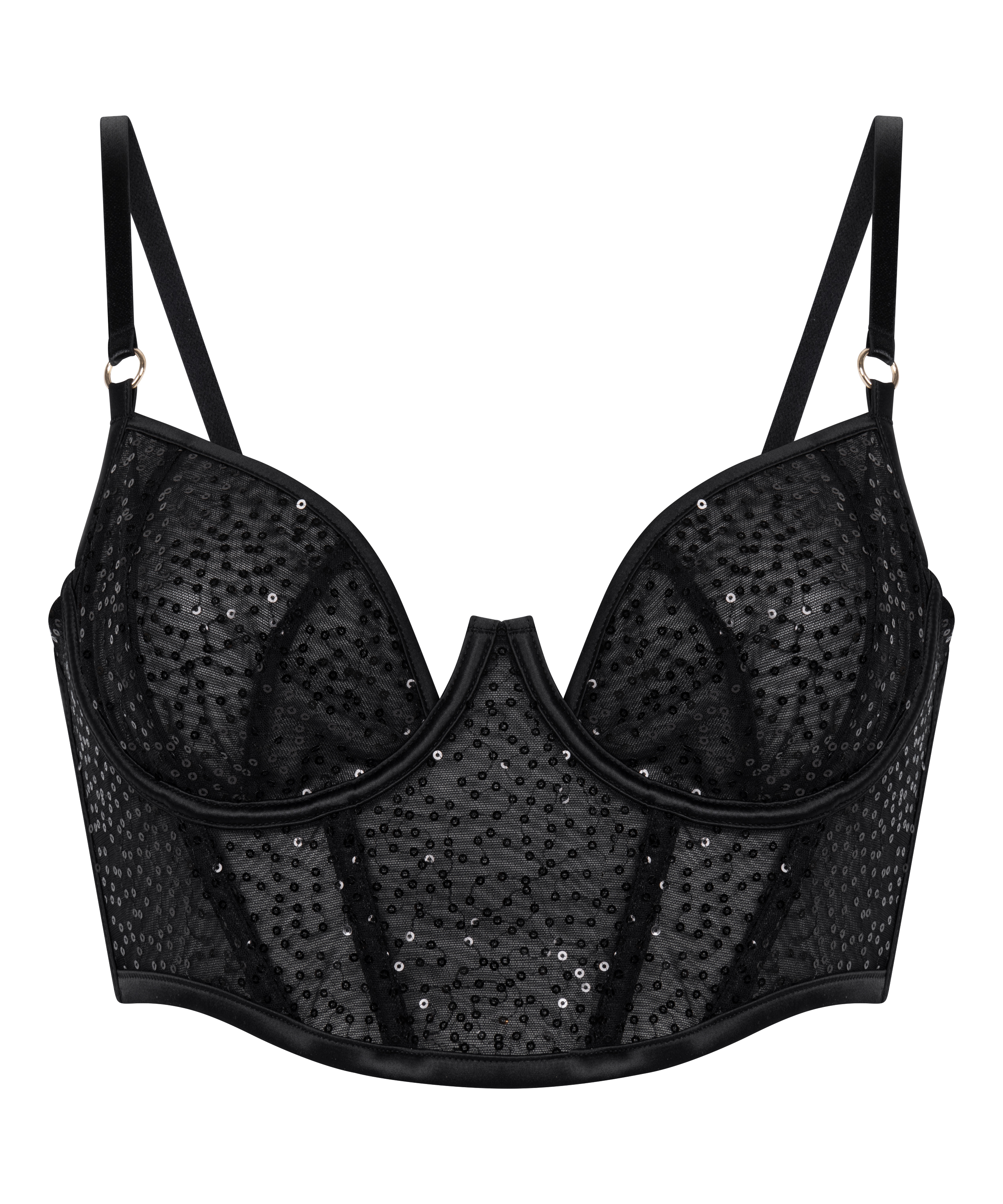 Haz una declaración de intenciones con este sujetador, donde la audacia se une a la belleza. Diseñado para esculpir y sujetar, este sujetador de aros no preformado presenta una favorecedora silueta longline que realza tu silueta natural. Cubierto de brillantes lentejuelas de purpurina, proporciona un brillo de alto impacto, mientras que el ajuste estructurado ofrece comodidad y elevación. Se puede combinar con la braguita a juego para lucir un look completo.
