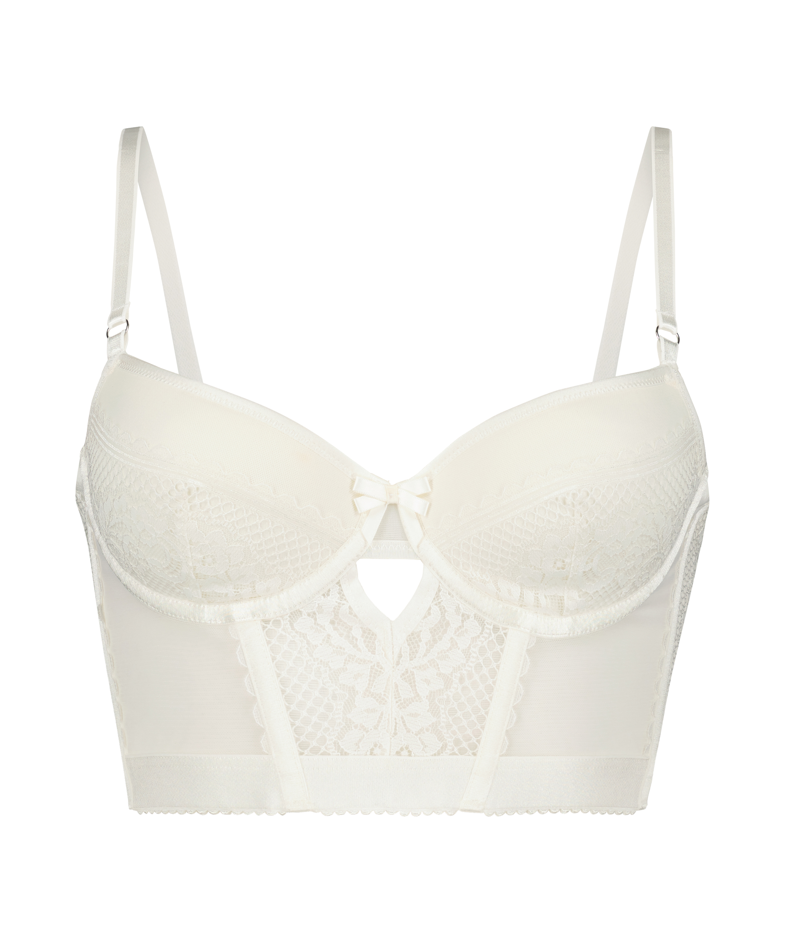 ¡Siéntete sexi con este precioso sujetador! El sujetador se adapta perfectamente a tu cuerpo gracias al estilo longline y los detalles de encaje y rejilla le dan un toque muy chic. El sujetador tiene un lacito en la parte delantera. ¡Combínalo con la braguita a juego para conseguir un bonito look!