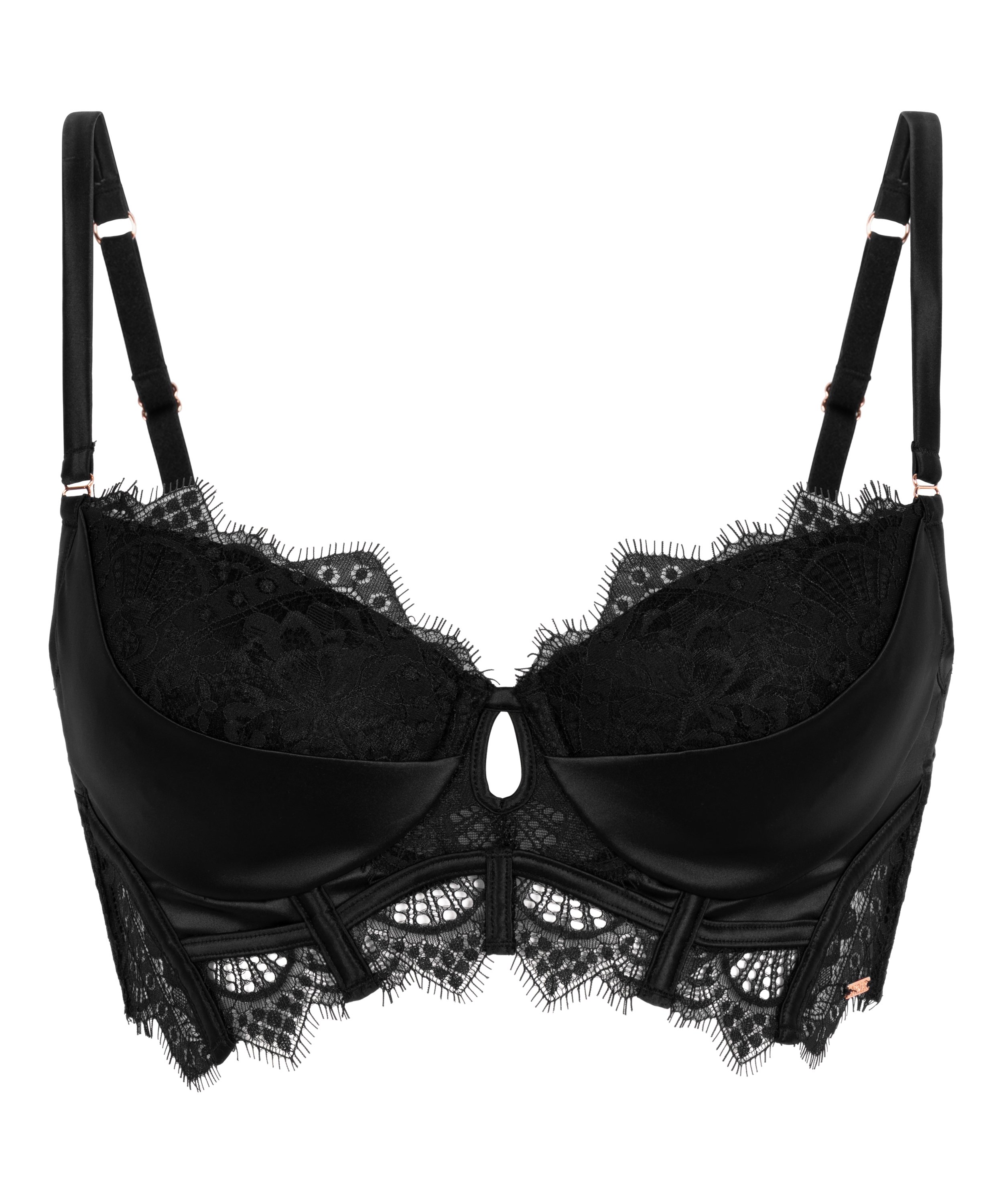 ¡Siéntete súper atractiva con este sujetador longline de aros preformado! El sujetador tiene un acabado con detallles de encaje, rejilla y satén, ¡y por eso tiene un aspecto suntuoso! El encaje se extiende hasta los tirantes. Forma parte de la colección Noir.