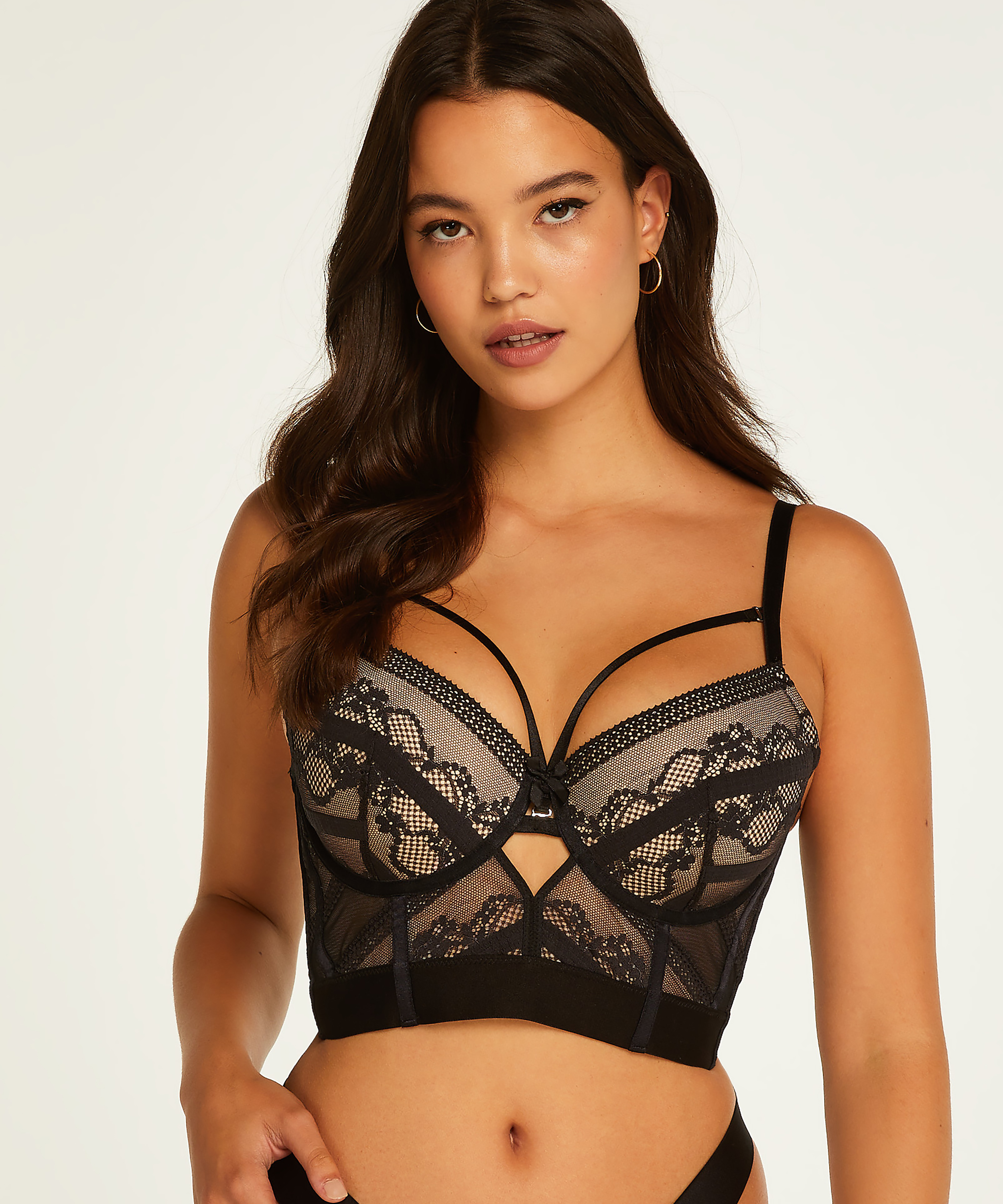 ¡Siéntete sexi con este precioso sujetador! El sujetador se adapta perfectamente a tu cuerpo gracias al estilo longline y los detalles de encaje y rejilla le dan un toque muy chic. El sujetador tiene un lacito en la parte delantera. ¡Combínalo con la braguita a juego para conseguir un bonito look!