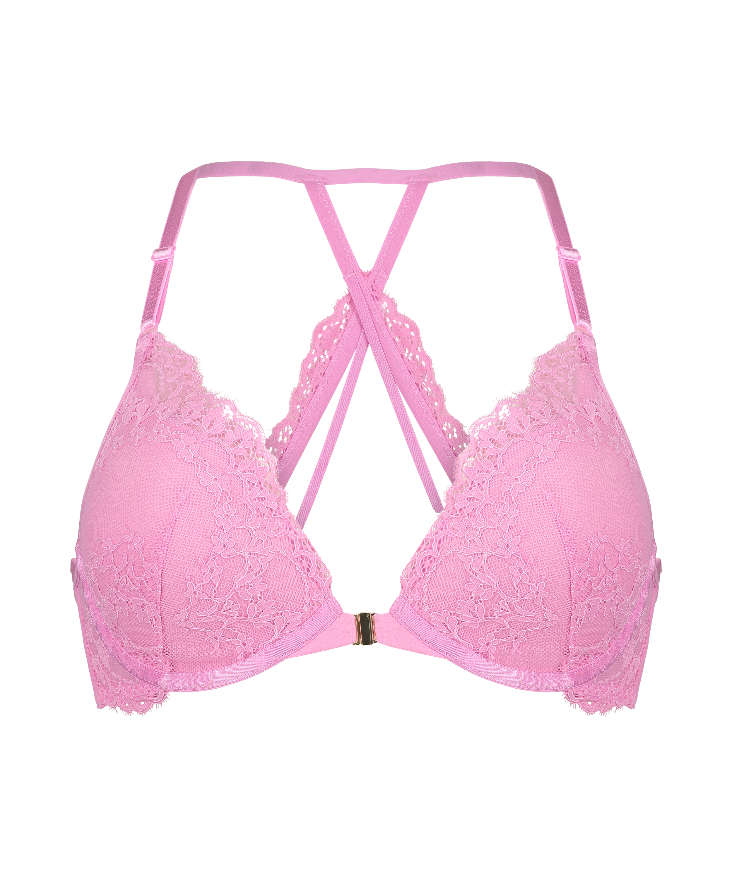 ¡Siéntete sexi con este sujetador realzador! Con cierre frontal para facilitar su uso y espalda deportiva con mucho encaje. Está decorado con detalles de recortes y tiras en las copas. ¡Encuentra las braguitas a juego para completar el conjunto!