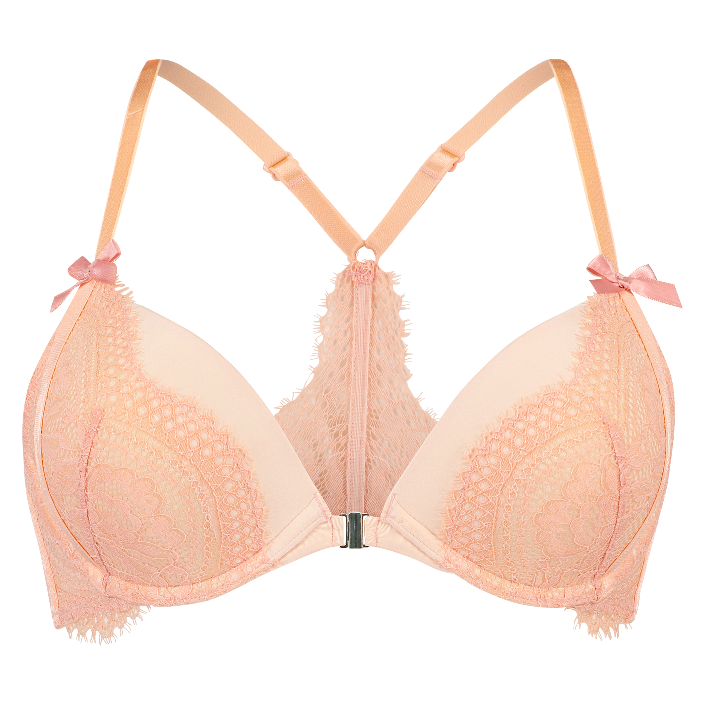 ¡Da un impulso a tu escote con este sujetador preformado con efecto realce! Este precioso sujetador tiene un cierre frontal y un racerback. Tiene un acabado con encaje en las copas, así como un detalle de encaje en la parte trasera. ¡Combínalo con una braguita a juego para completar tu conjunto!