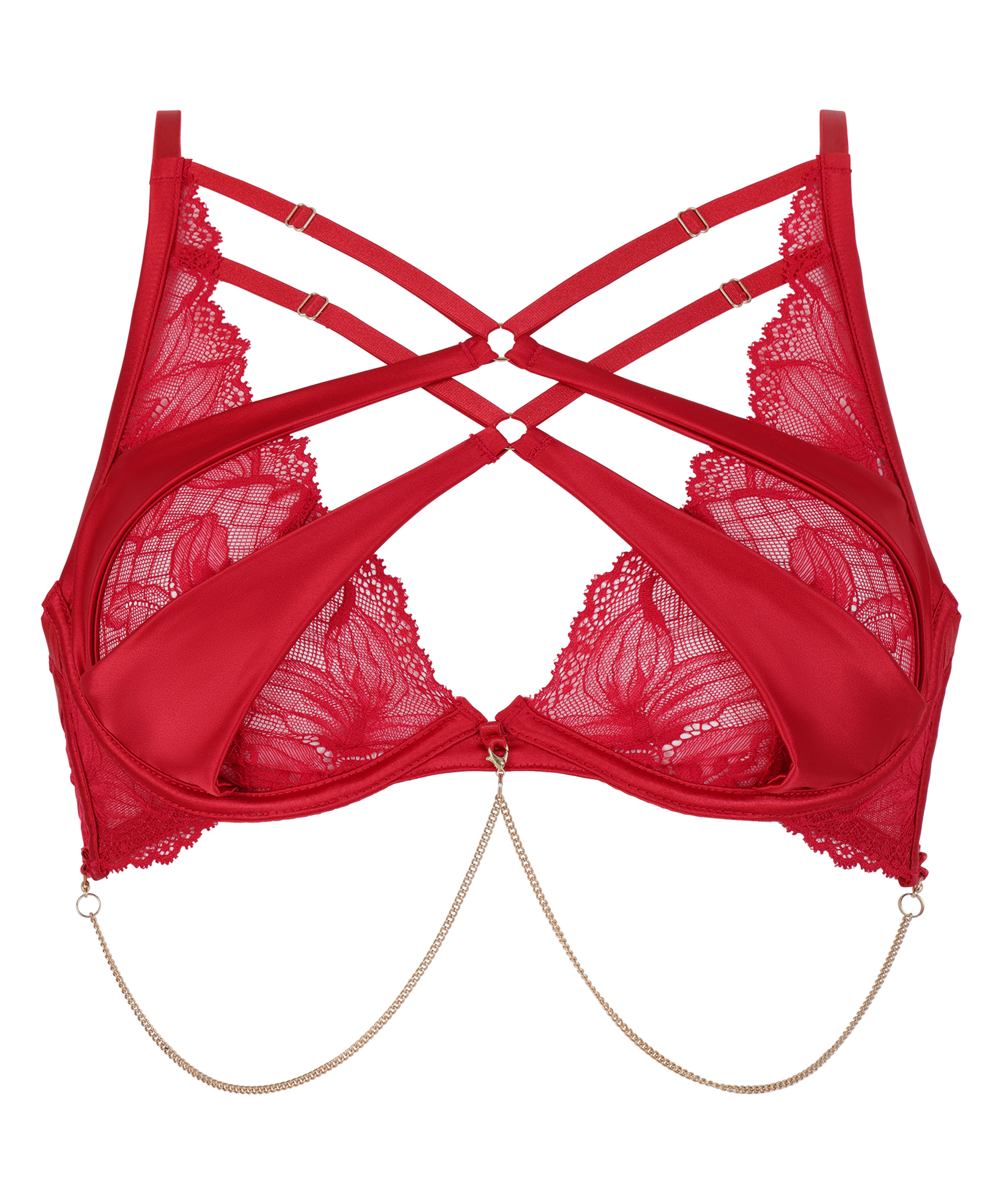 ¡Este sujetador sexy es absolutamente precioso! Tiene tirantes ajustables y copas con aros para mayor comodidad. El encaje de la parte delantera y la cadena dorada extraíble dan a este sujetador un aspecto sexy. Combínalo con las braguitas a juego. Forma parte de la colección Private.