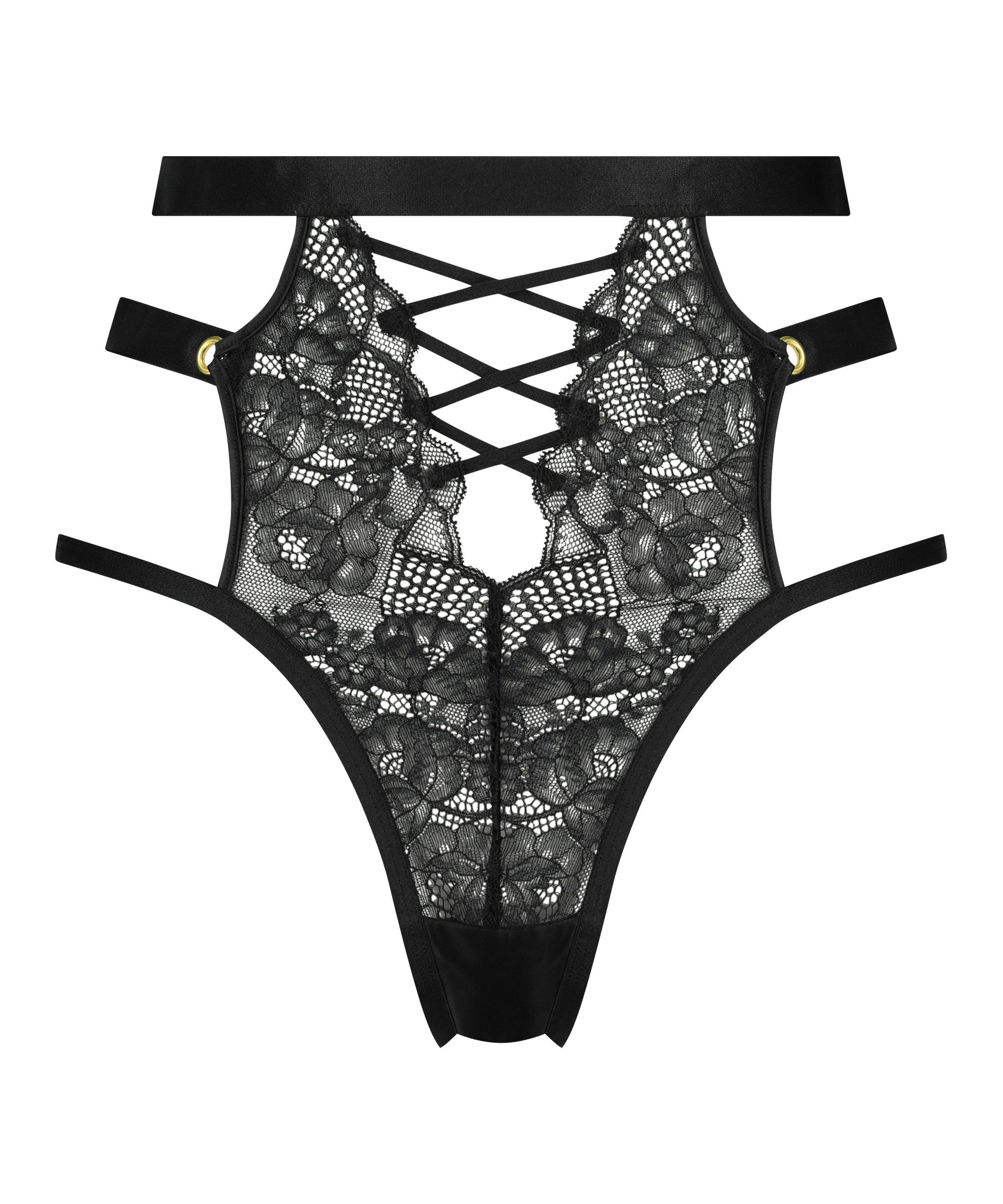 Disfruta de un look desafiante con este tanga. Contiene encaje, detalles recortados y es de tiro alto. Combínalo con los artículos que hacen juego. Forma parte de la colección Private.