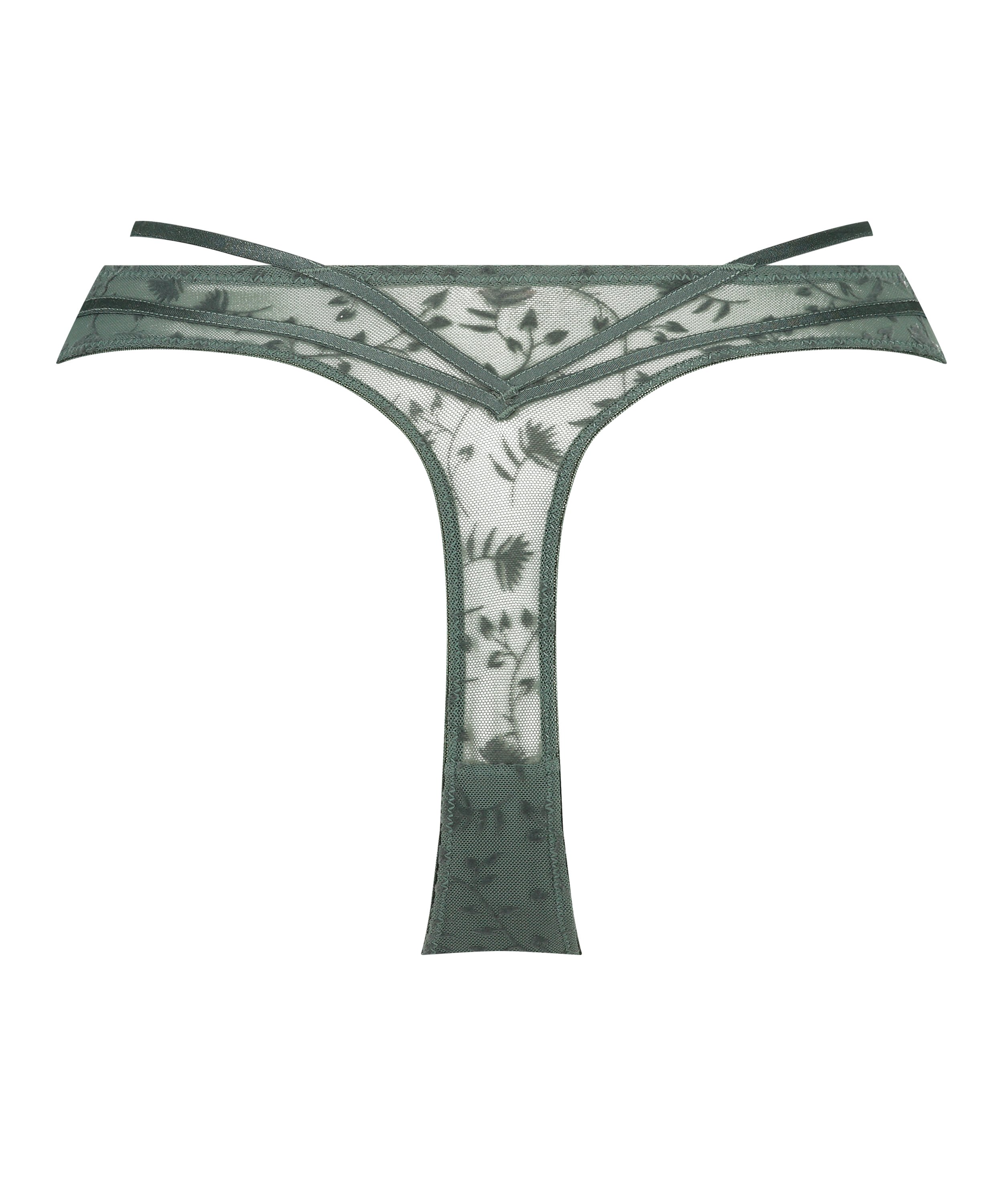 Abraza tu confianza y confianza con este impresionante tanga. Está confeccionado en malla, rematado con un sutil estampado de flores, y tiene detalles de tiras que le dan un acabado sensual. ¡Combínalo con tu sujetador favorito!