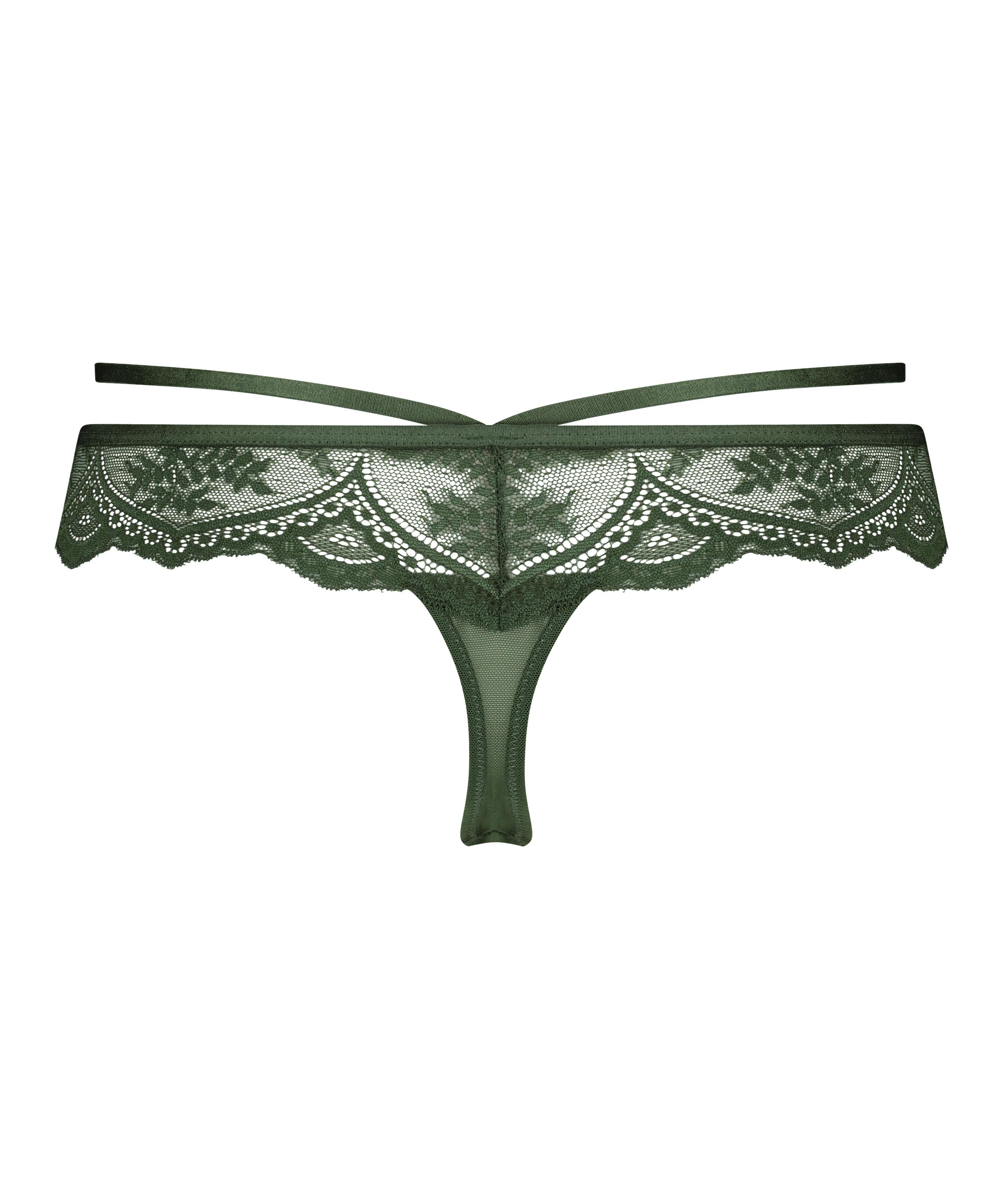 Esta braguita tan ideal está hecha por completo de encaje. El tanga tiene un lazo en la parte delantera y detalles de tiras. Combínalo con un sujetador o bralette a juego para lucir un conjunto ideal.