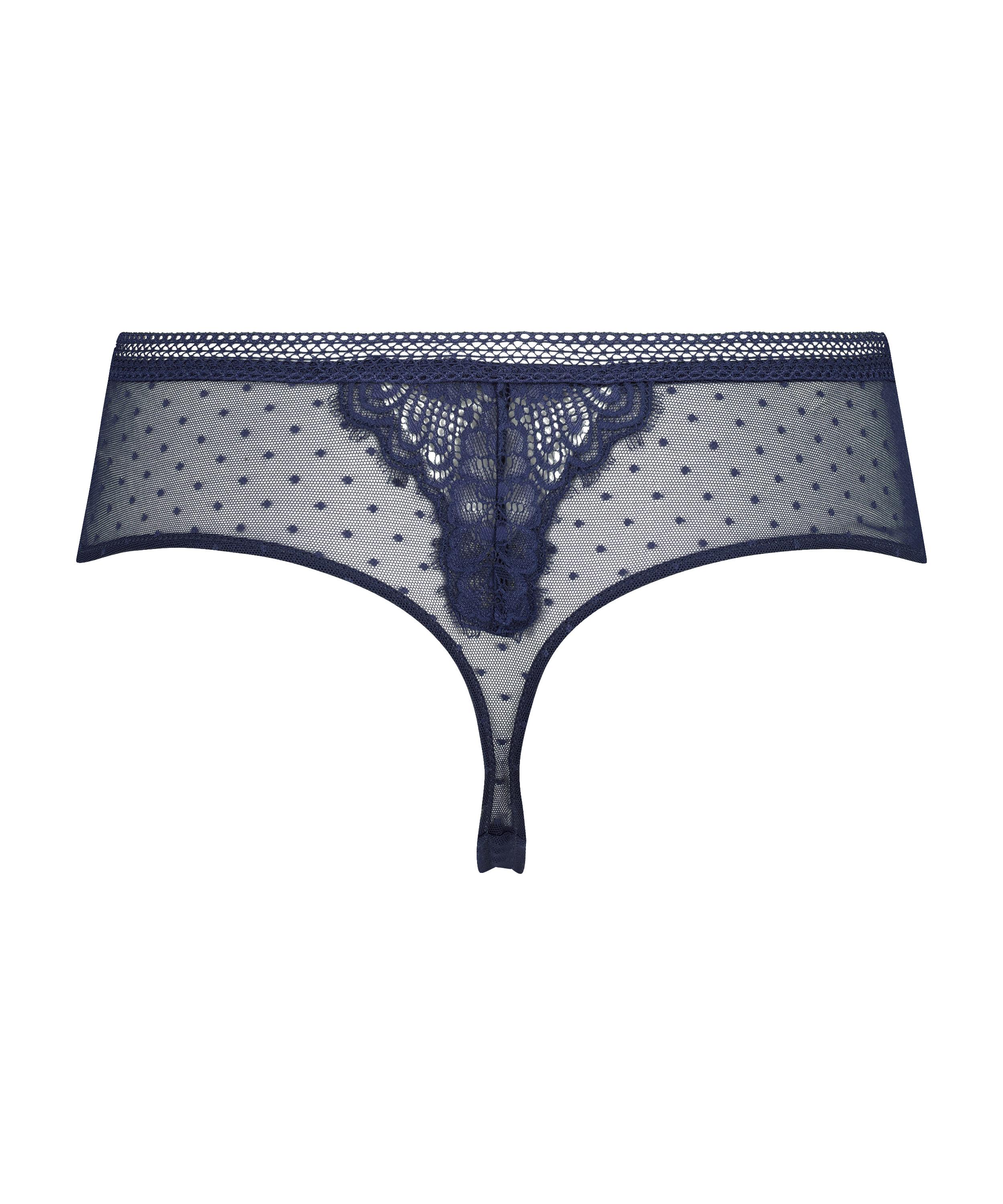 ¡Date un capricho con este precioso tanga bóxer! Este tanga está cubierto casi por completo con un estampado de lunares y encaje. En la parte delantera tiene un tierno lacito. ¡Combina este tanga con el sujetador a juego para completar tu conjunto!