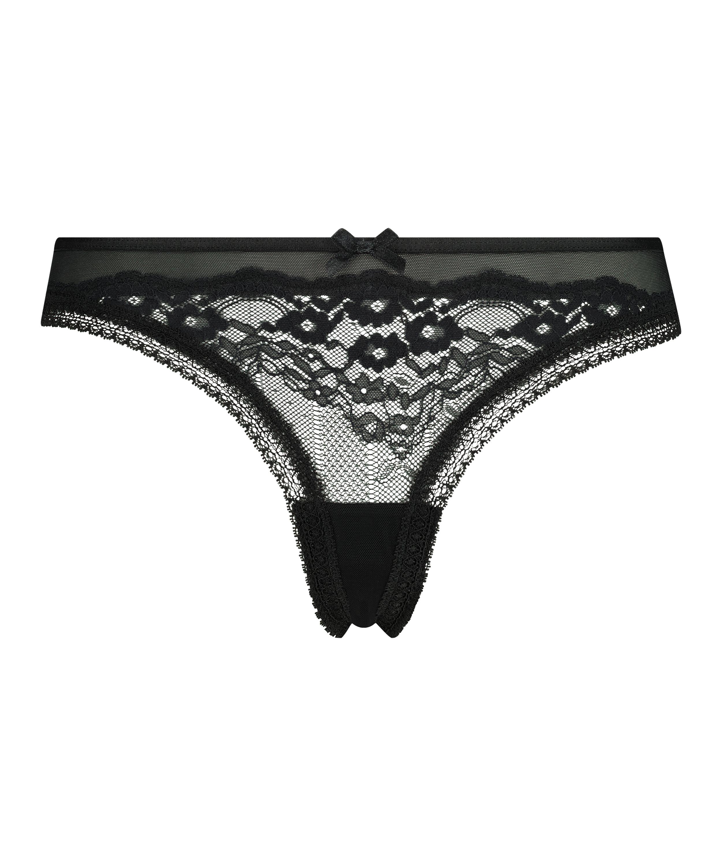 ¡Con este tanga estás muy sexi! El tanga tiene un acabado de encaje y rejilla y tiene un lazo en la parte delantera. Combina este tanga con el sujetador a juego para completar tu conjunto.
