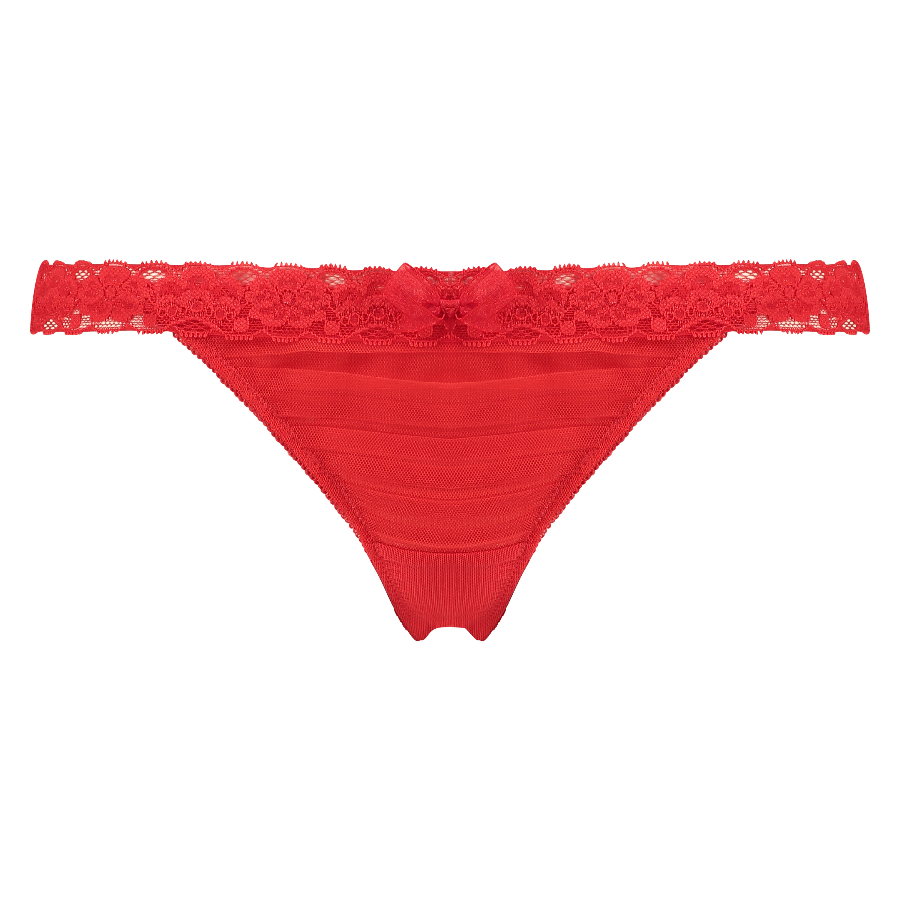 Este tanga es de encaje semitransparente. El ribete superior tiene adornos en forma de blondas con un lazo.