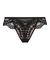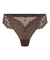 Moderno tanga hecho de encaje transparente en la parte delantera y de tejido de rejilla en la parte trasera. Un pequeño botón en el centro de la parte delantera añade el toque final.