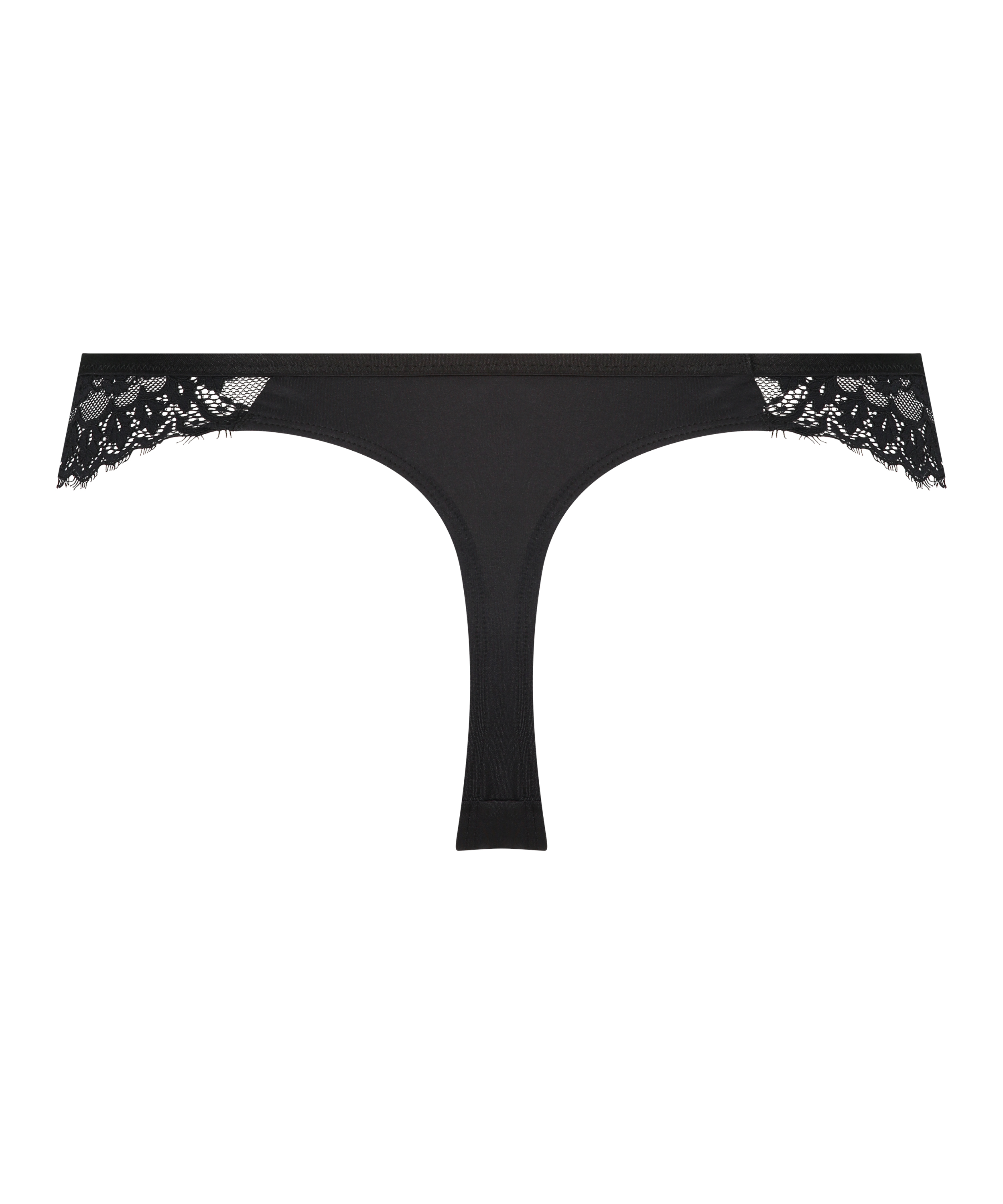 Moderno tanga hecho de encaje transparente en la parte delantera y de tejido de rejilla en la parte trasera. Un pequeño botón en el centro de la parte delantera añade el toque final.