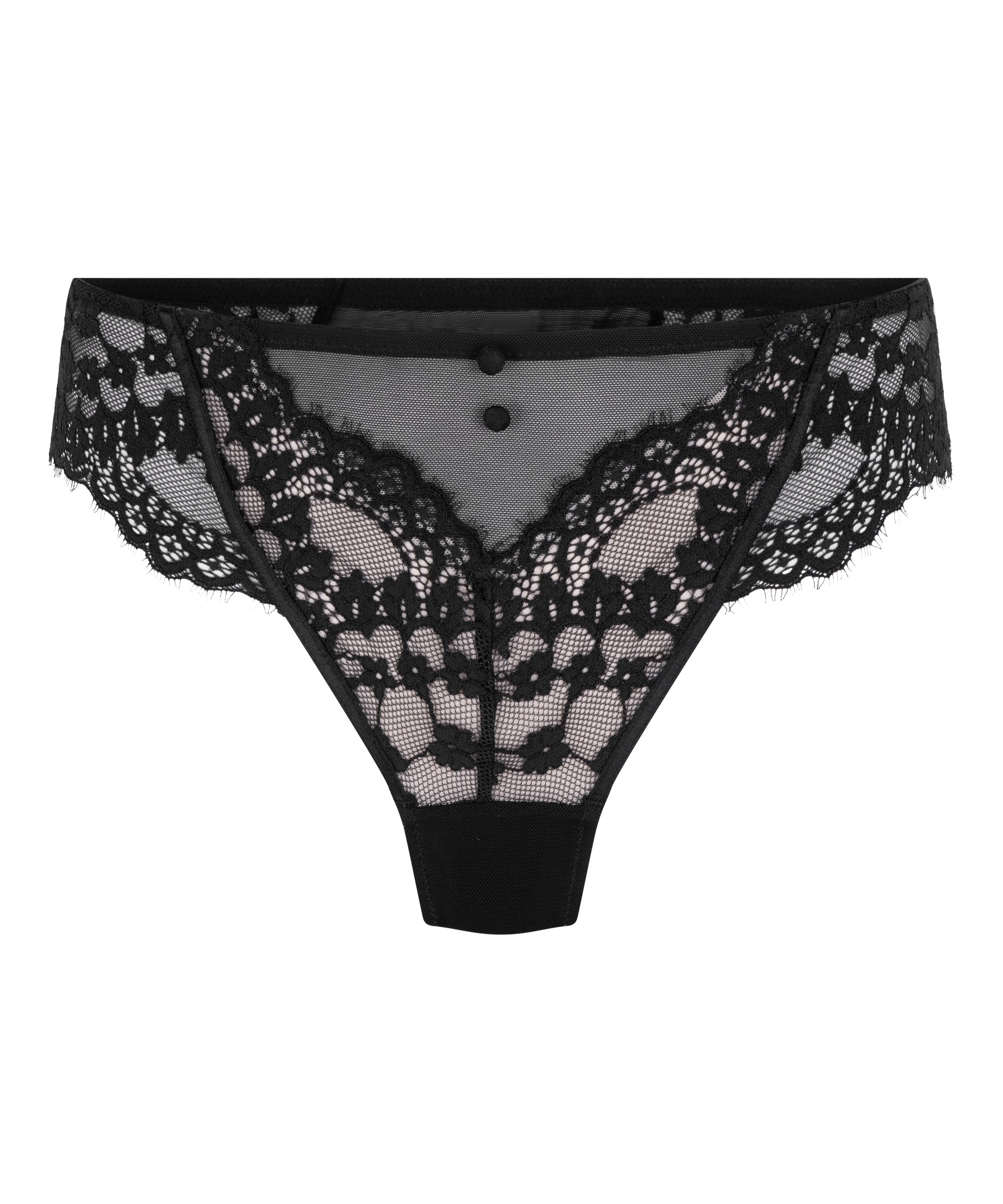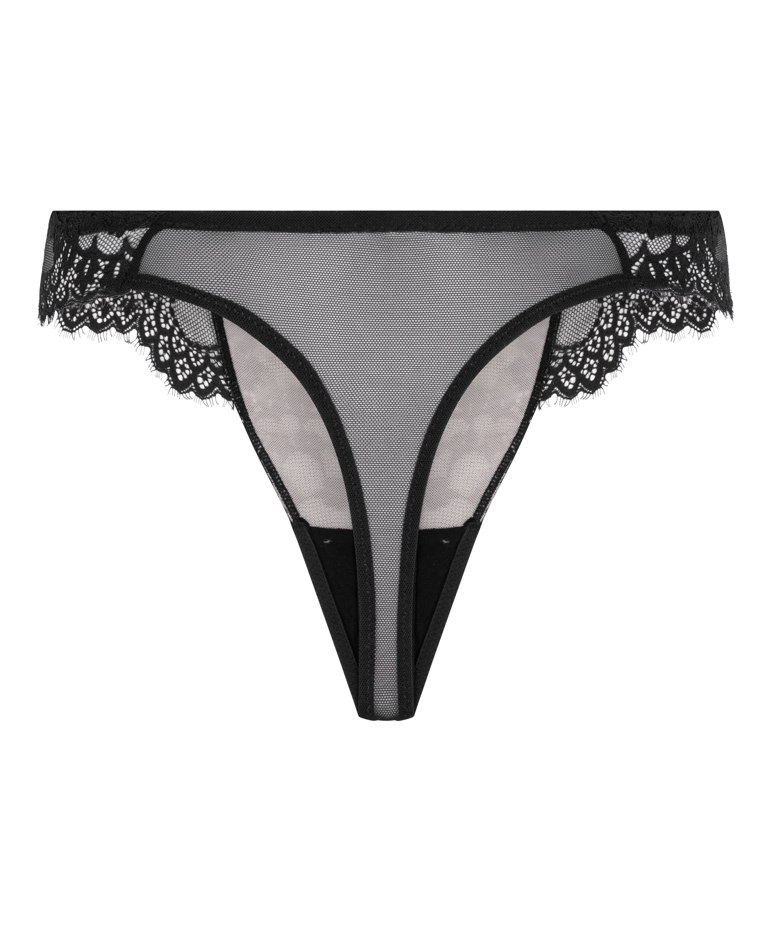 Moderno tanga hecho de encaje transparente en la parte delantera y de tejido de rejilla en la parte trasera. Un pequeño botón en el centro de la parte delantera añade el toque final.