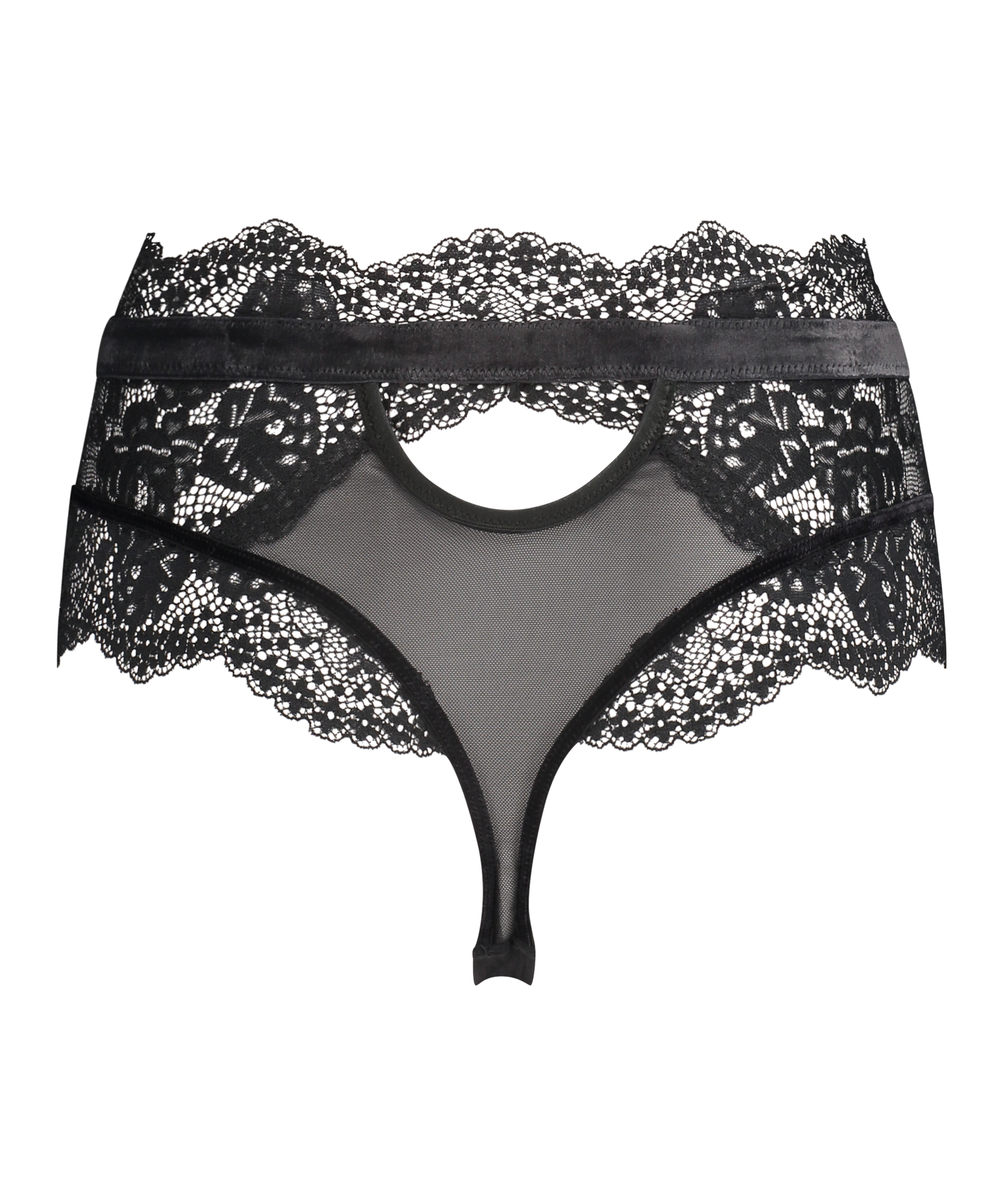 Si te gusta el encaje, este tanga es perfecto para ti. Están hechos completamente de encaje semitransparente y tienen un acabado con una cintura elástica de terciopelo. ¡Siempre a la moda! Forma parte de la colección Rebecca Mir.