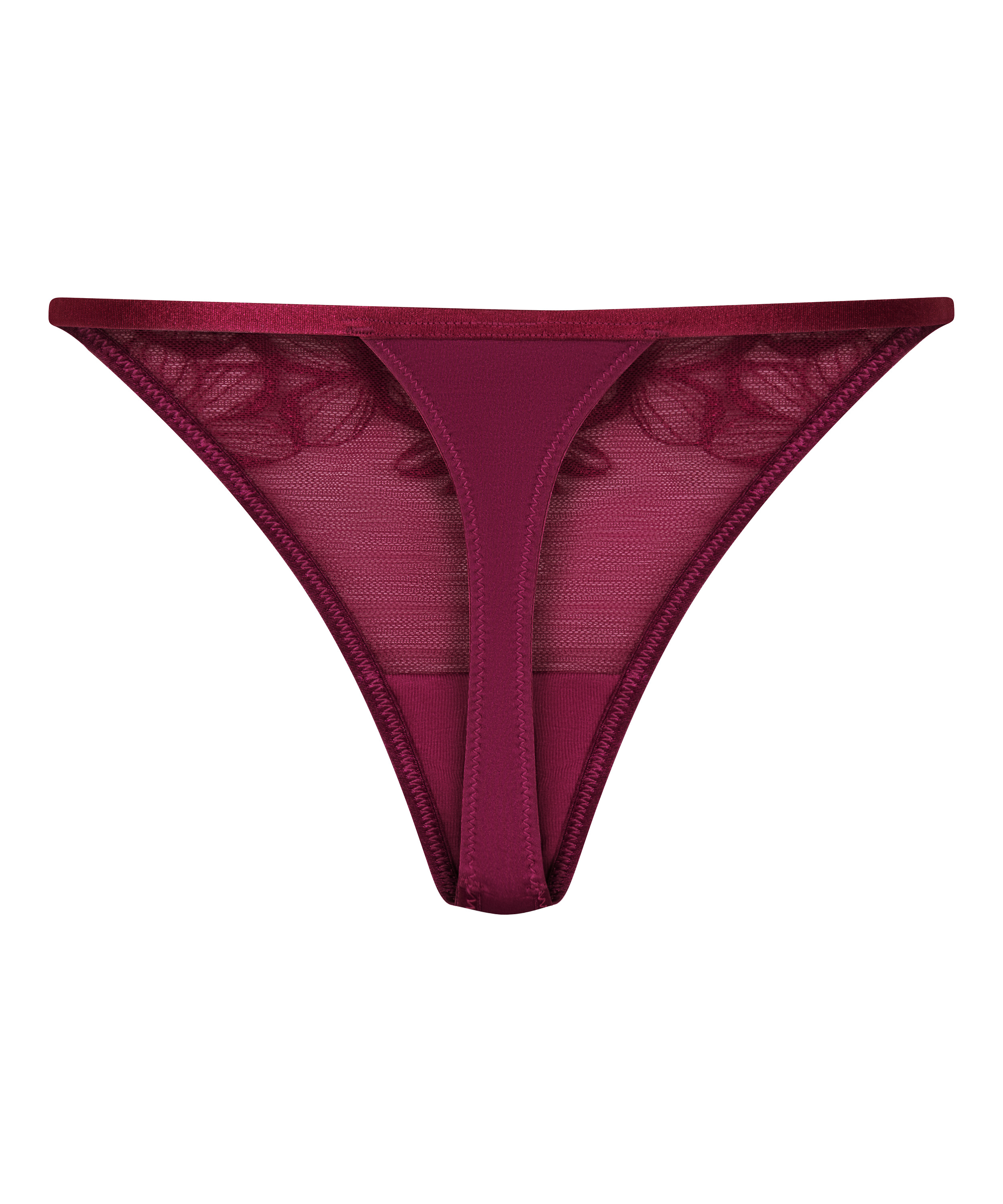 Delicado pero atrevido, este tanga está diseñado para realzar tu figura con un toque de encanto romántico. Confeccionado en malla, presenta bordados florales que añaden elegancia y textura. El corte alto alarga la silueta, mientras que la mínima cobertura en la parte trasera mantiene el look atrevido y moderno. Se puede combinar con el sujetador a juego para un look completo.