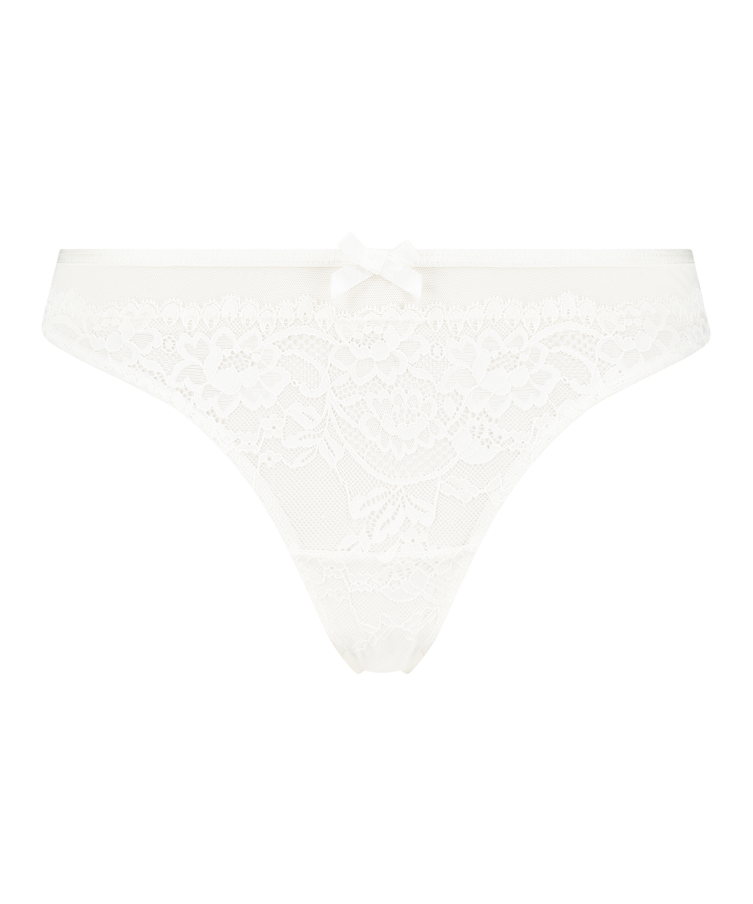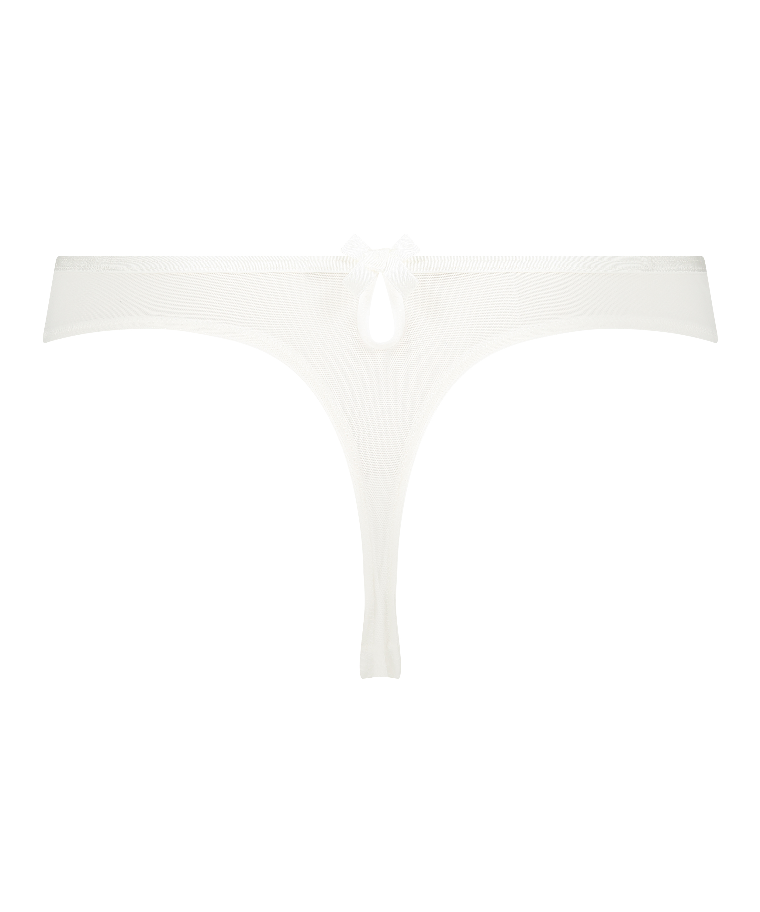 ¡Este tanga es precioso! Es semitransparente y los laterales cuentan con un acabado de encaje. El lacito en la parte delantera le aporta un toque muy femenino.