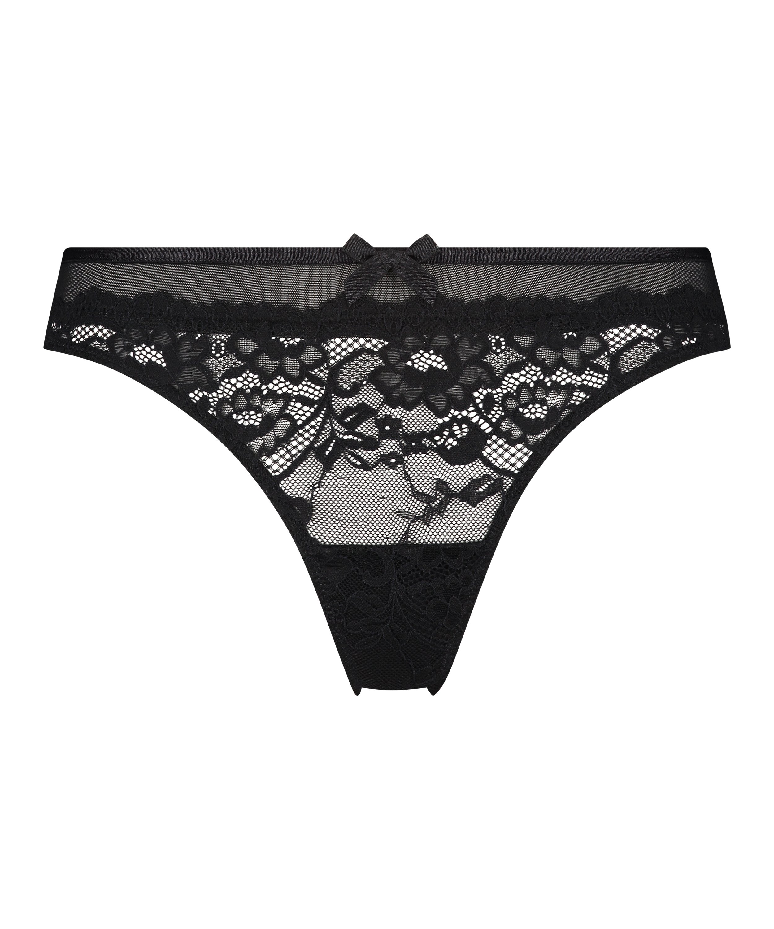 ¡Este tanga es precioso! Es semitransparente y los laterales cuentan con un acabado de encaje. El lacito en la parte delantera le aporta un toque muy femenino.