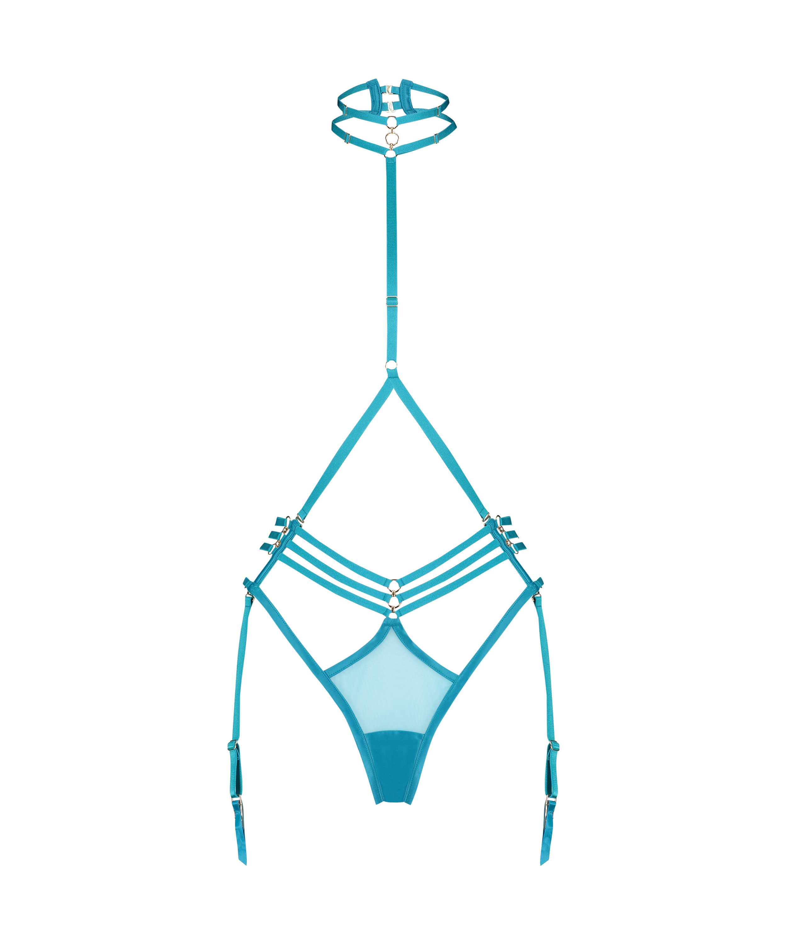 Déjate seducir por nuestro tanga Eros. El tanga en sí está elaborado con cautivadores detalles de tiras interconectadas con elegantes anillas. Diseñado para ofrecer la máxima versatilidad, cuenta con tiras desmontables y un collar de tiras también desmontable para el cuerpo, para personalizar tu look cómodamente. Este tanga, confeccionado con delicada rejilla, aporta un toque atractivo e innegablemente sexi. Al combinarlo con el bralette Eros y sus medias, crearás un conjunto seductor que dejará huella.