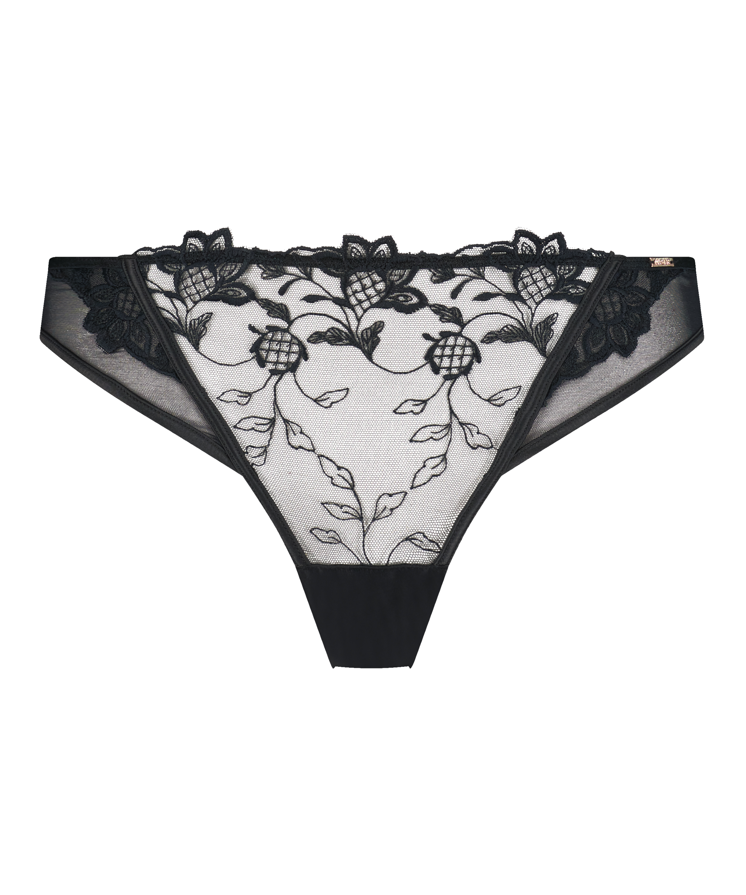 ¡Siente la elegancia con este impresionante tanga! Con un «look» sensual semitransparente con bordados, encaje y detalles de malla en la parte frontal y trasera. ¡Encuentra un sujetador a juego para completar el conjunto! Forma parte de nuestra colección Noir.