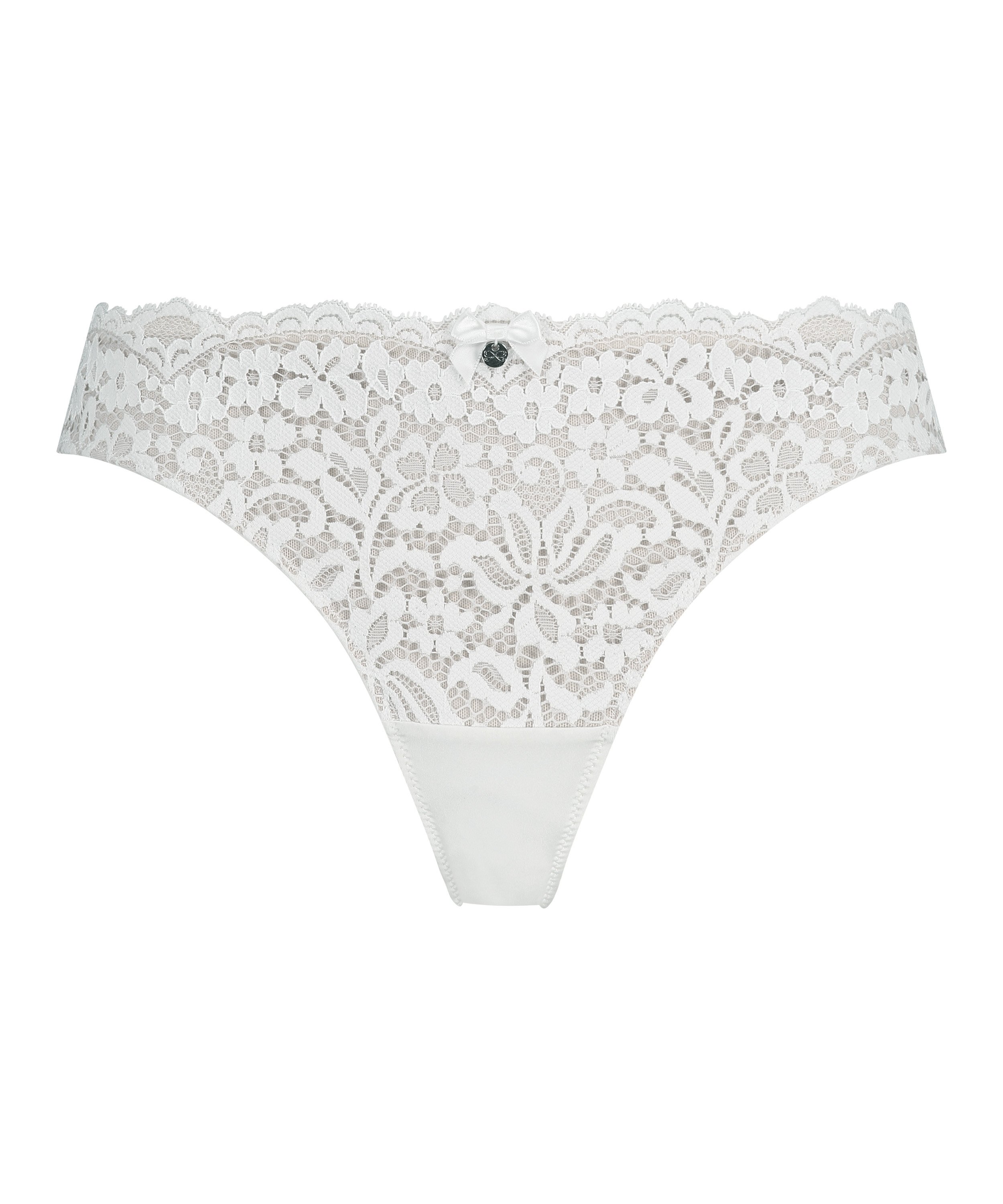 ¡Este tanga te quedará fabuloso! Tiene un acabado de encaje en un motivo floral y cuenta con un lacito en el medio. Combínalo con el sujetador a juego para completar tu conjunto.