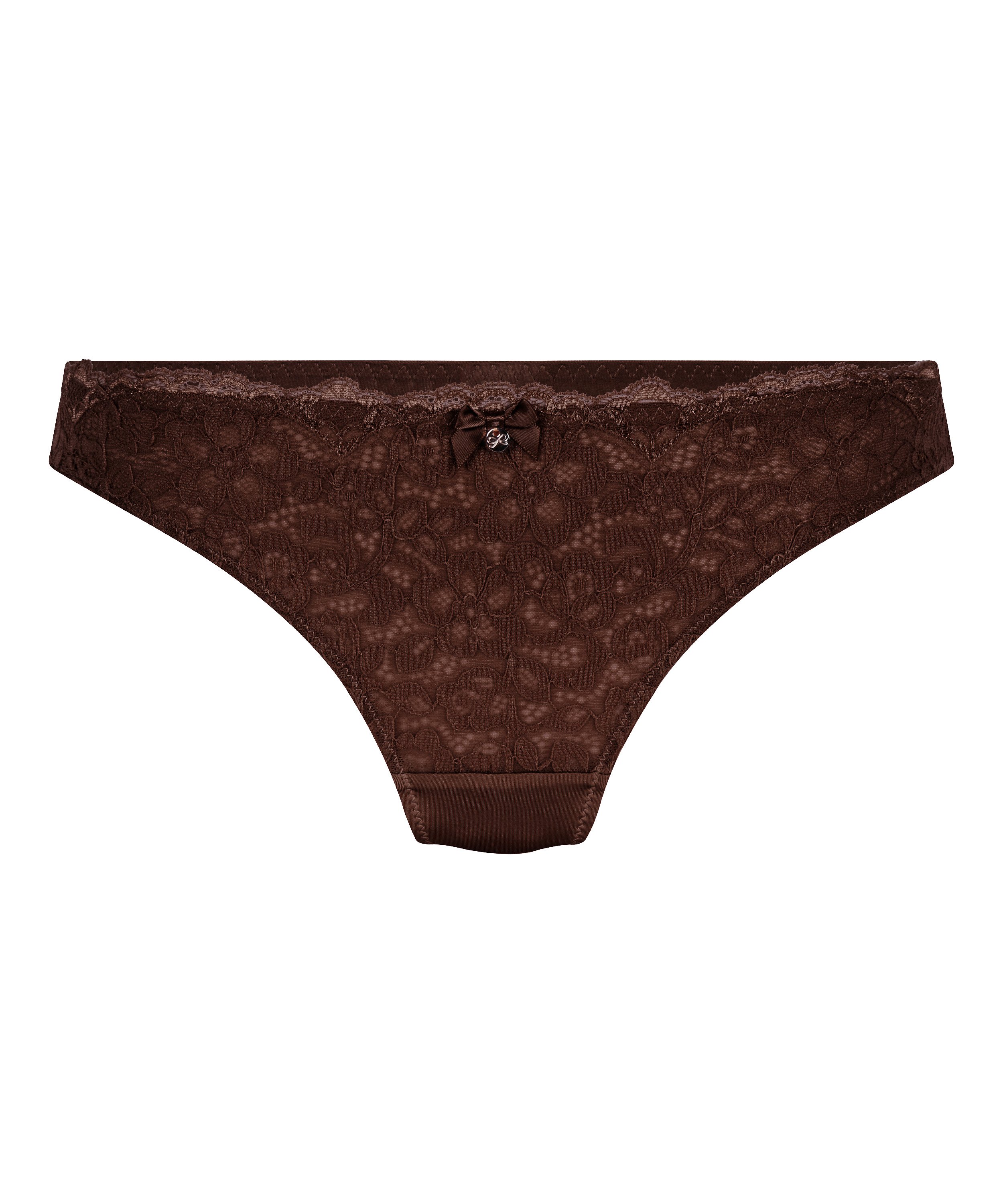 ¡Este tanga te quedará fabuloso! Tiene un acabado de encaje en un motivo floral y cuenta con un lacito en el medio. Combínalo con el sujetador a juego para completar tu conjunto.