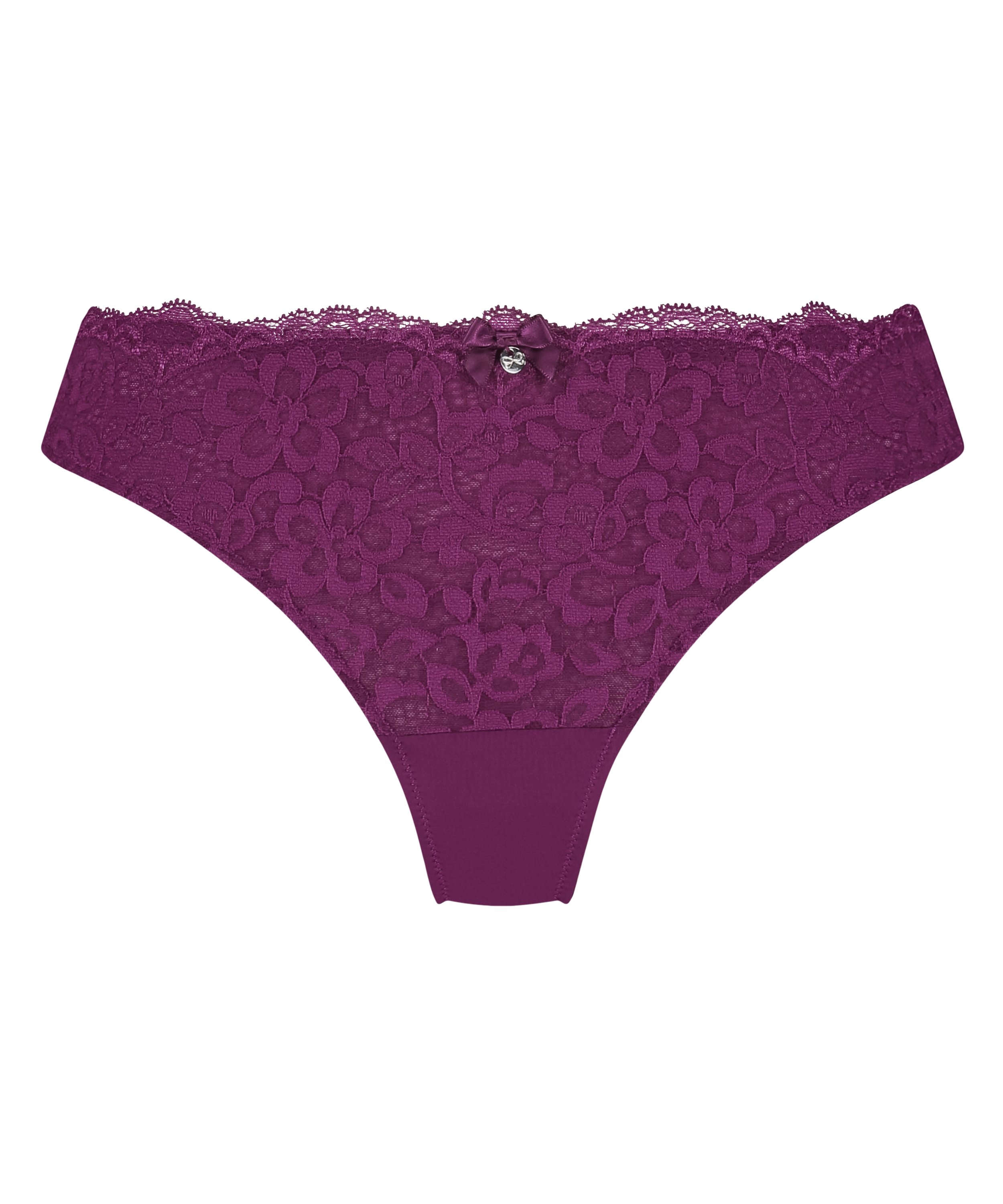 ¡Este tanga te quedará fabuloso! Tiene un acabado de encaje en un motivo floral y cuenta con un lacito en el medio. Combínalo con el sujetador a juego para completar tu conjunto.